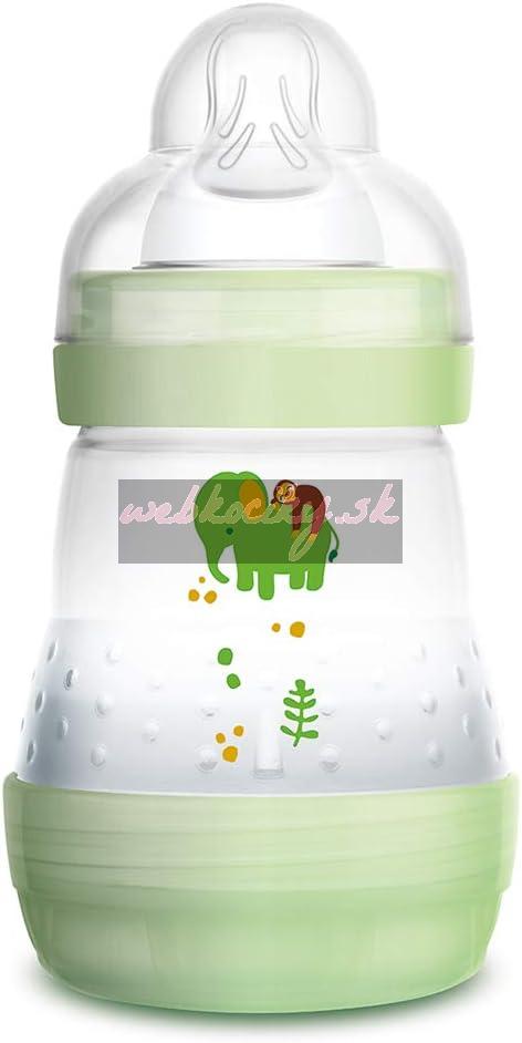 v sade 2 fľaše MAM Anti-Colic 160ml v zelenej farbe fľaše Anti Colic s cumlíkmi s pomalým prietokom.