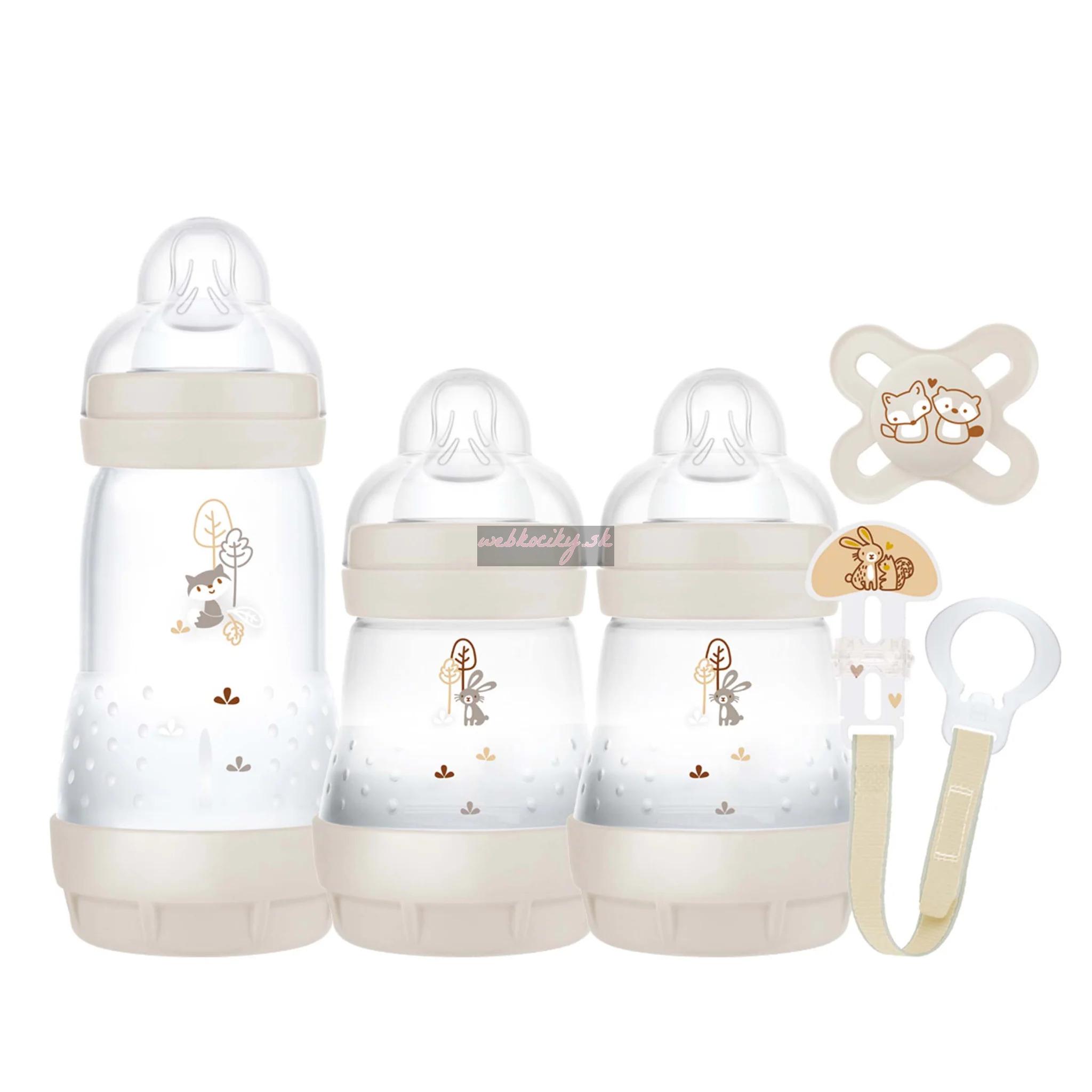 Balenie obsahuje 2 x MAM Fľaša Anti-Colic 160 ml, 1 x MAM Fľaša Anti-Colic 260 ml, 1 x MAM cumlík Štart (0 - 2 mesiace) v praktickom sterilizačnom boxe a 1 x MAM Clip pásik na cumlík.