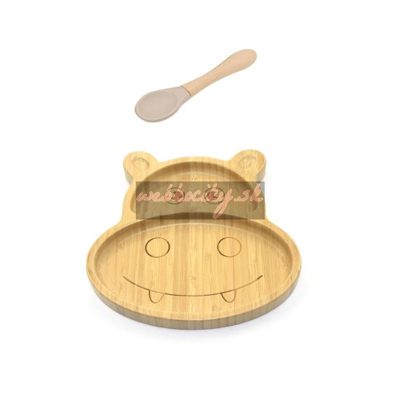 Martons Bambusový tanier s prísavkou a lyžičkou pre bábätká – Hroch, 22×17 cm, béžová