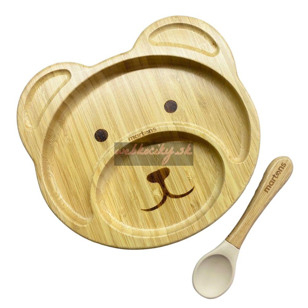 Martons Bambusový tanier s prísavkou a lyžičkou pre bábätká – Macík, 22×17 cm, béžová