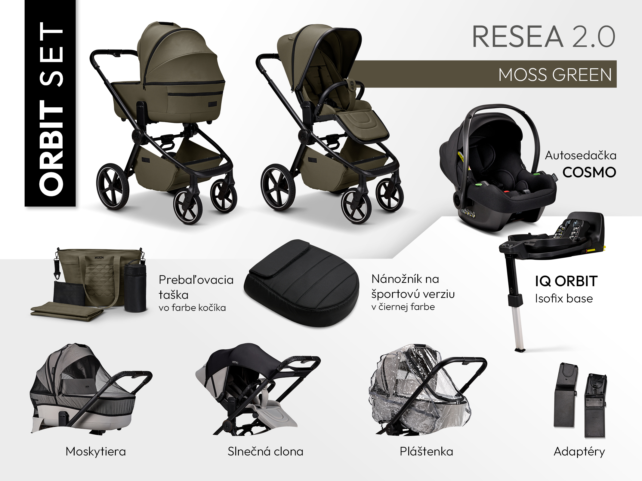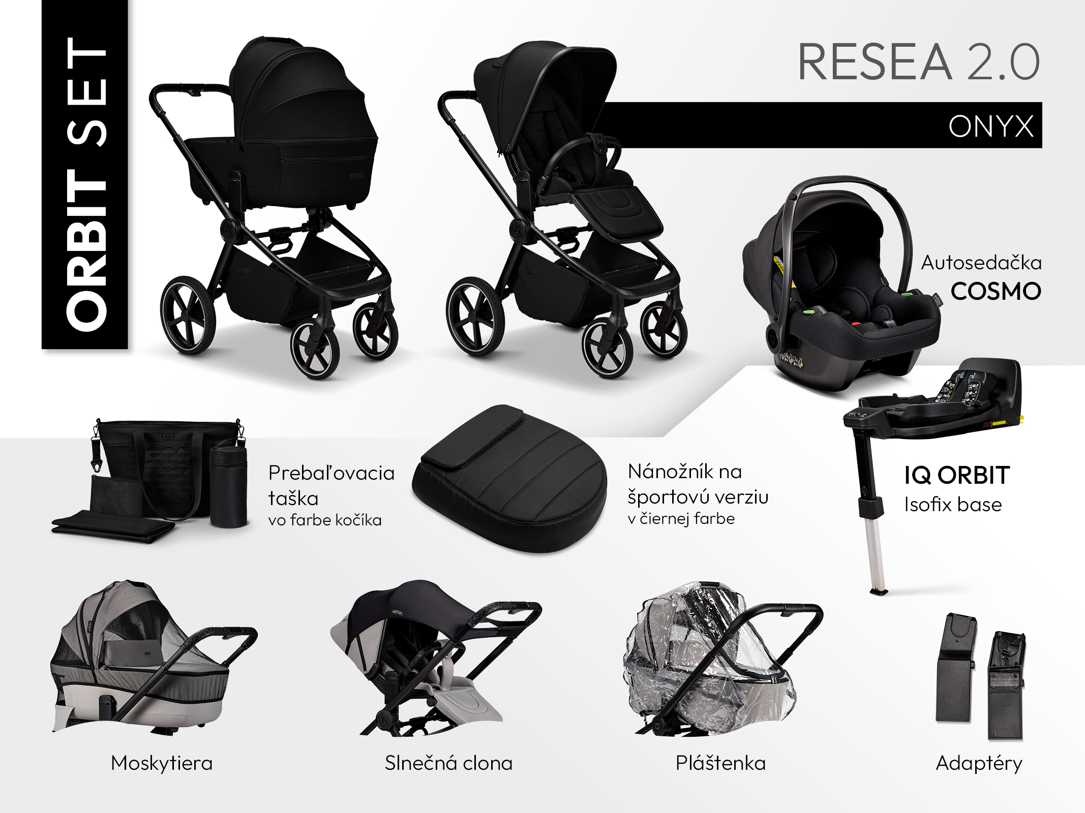 Pre rodičov, ktorí chcú mať všetko potrebné pohromade, je k dispozícii ORBIT SET, ktorý okrem samotného kočíka obsahuje aj: