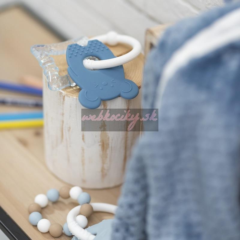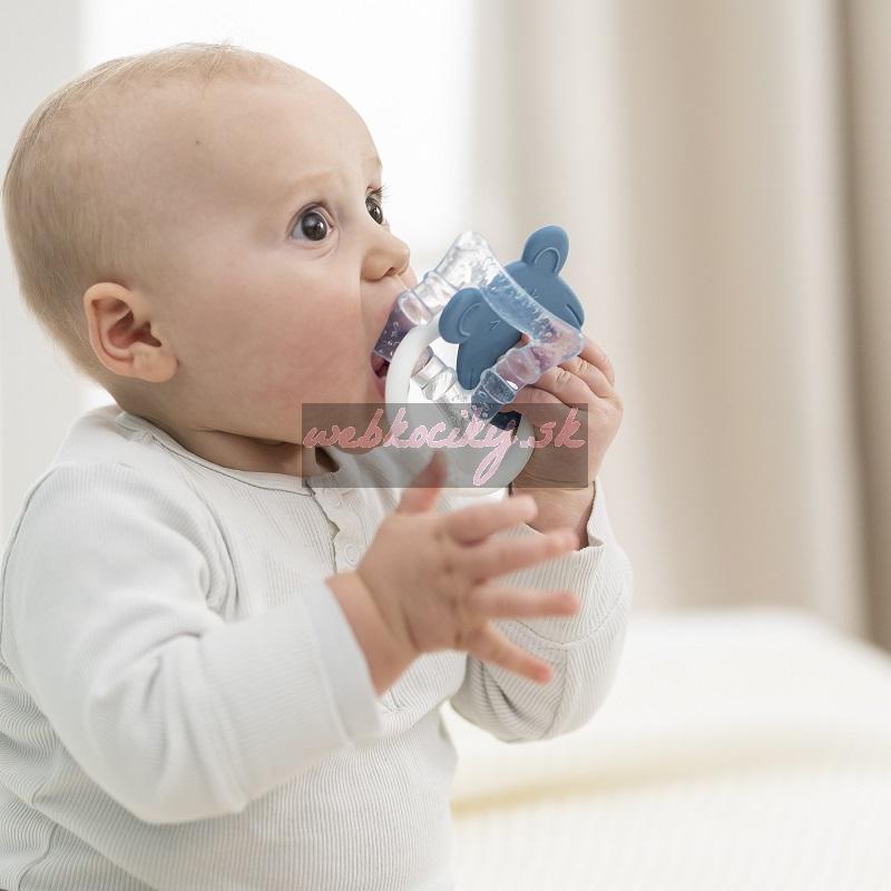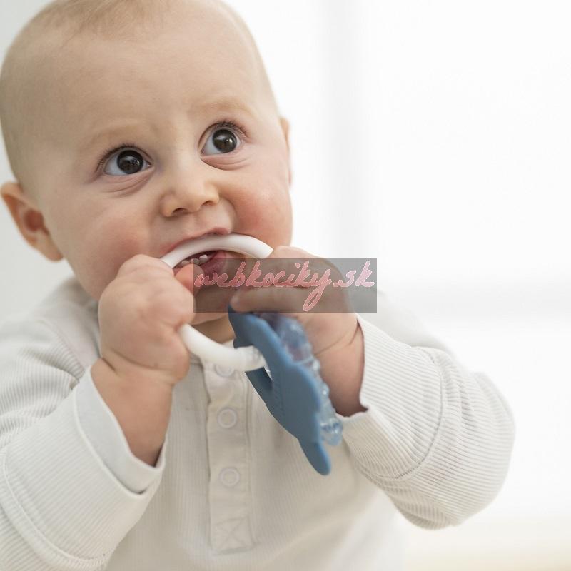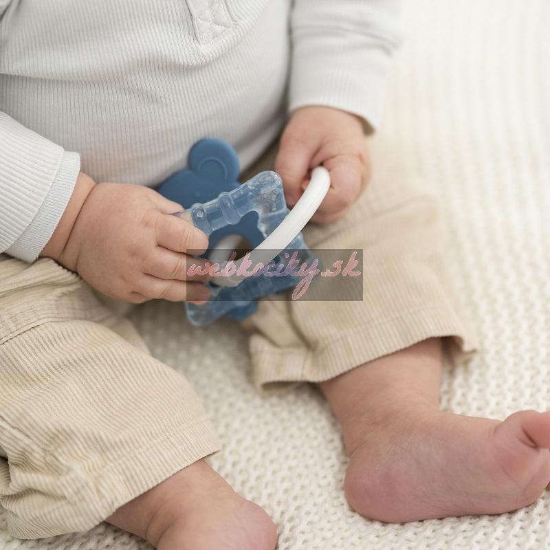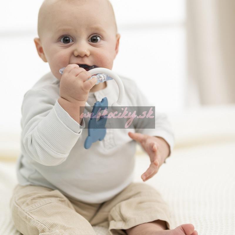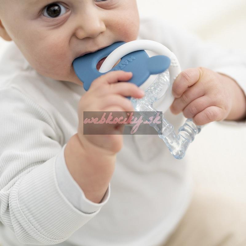 Silikónová hryzačka so štruktúrovaným povrchom a chladiacim prvkom je vhodná na masáž, osvieženie ďasien a na zmiernenie bolesti pri raste zúbkov.