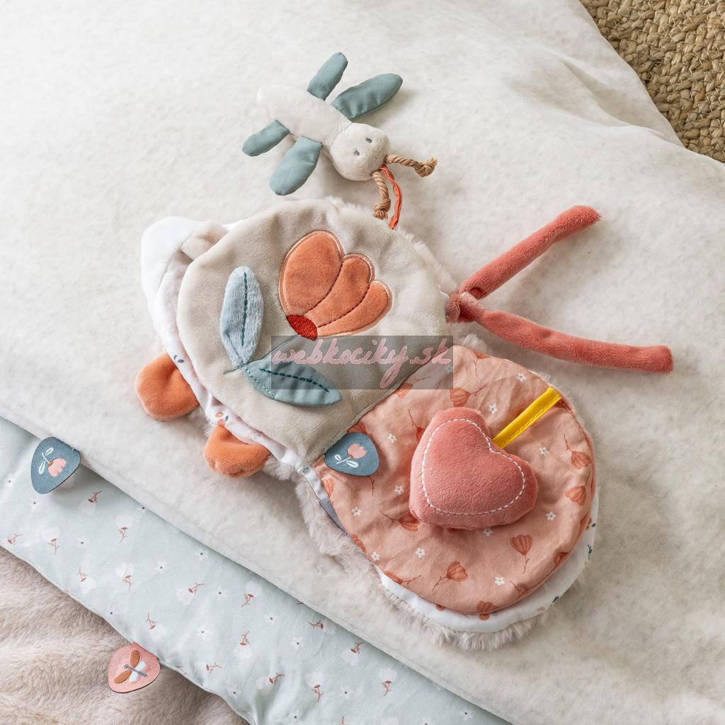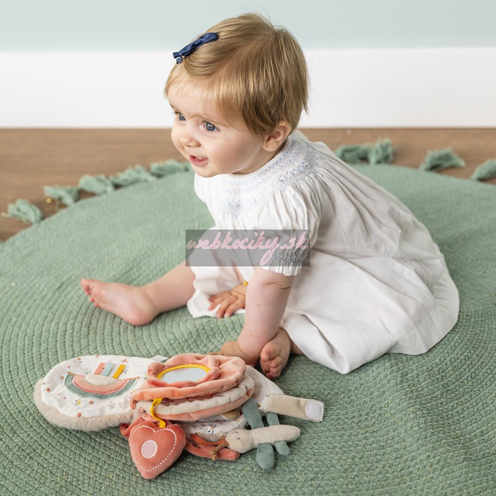 Mäkká plyšová knižka s farebnými motívmi a zábavnými aktivitami je dokonalým spoločníkom vášho bábätka. Knižka ponúka množstvo detailov a možností pre uchopenie a dotyk a má dokonalý tvar aj pre tie najmenšie ručičky. Vďaka rôznym materiálom a tvarom pomáha rozvíjať hmat a motoriku. Pri jej listovaní objavíte integrované bezpečné zrkadielko, veselé zvieratká a stužky, ktoré ponúknu plné stránky zábavy