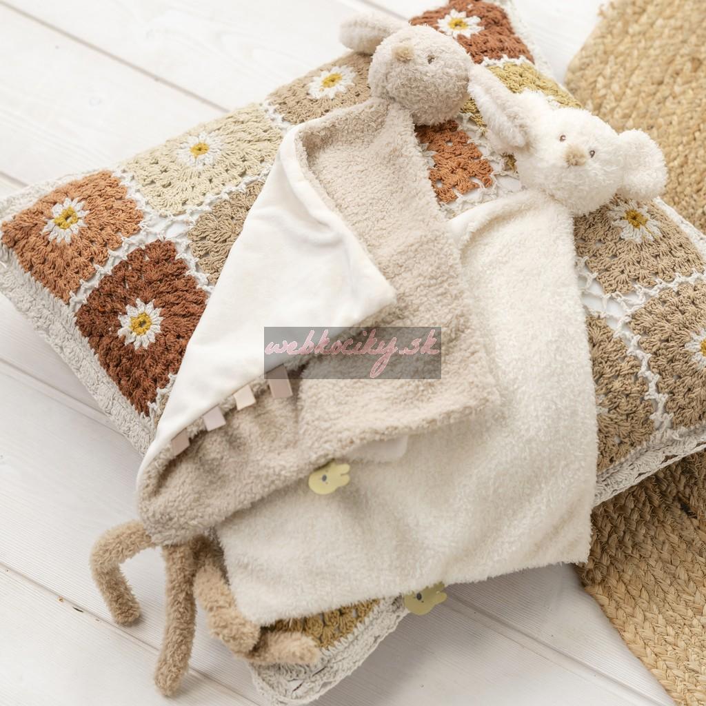 Mäkučká dečka s milým motívom ponúka množstvo úchopových možností, ktoré podporujú rozvoj zmyslov a jemnej motoriky. Dieťatko môže pohodlne chytať hlavičku zvieratka alebo zaujímavé visačky po stranách. Praktické pútko umožňuje pripevniť cumlík, aby bol vždy po ruke.