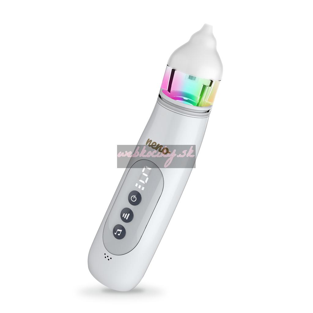 Farebné LED svetlá: Farebné LED svetlá v rôznych odtieňoch priťahujú pozornosť dieťaťa a pomáhajú sústrediť sa na atraktívny vizuálny prvok. Vďaka tomu je dieťa menej stresované a pokojnejšie po celú dobu ošetrenia. Táto funkcia podporuje pohodlie dieťaťa a zvyšuje pohodlie pri používaní odsávačky v každodennej starostlivosti. Ďalšie svetelné podnety priťahujú pozornosť dieťaťa a vytvárajú pozitívne asociácie s ošetrením. Toto praktické riešenie umožňuje rýchlejšie a pohodlnejšie čistenie nosa ako pre dieťa, tak aj pre rodičov.