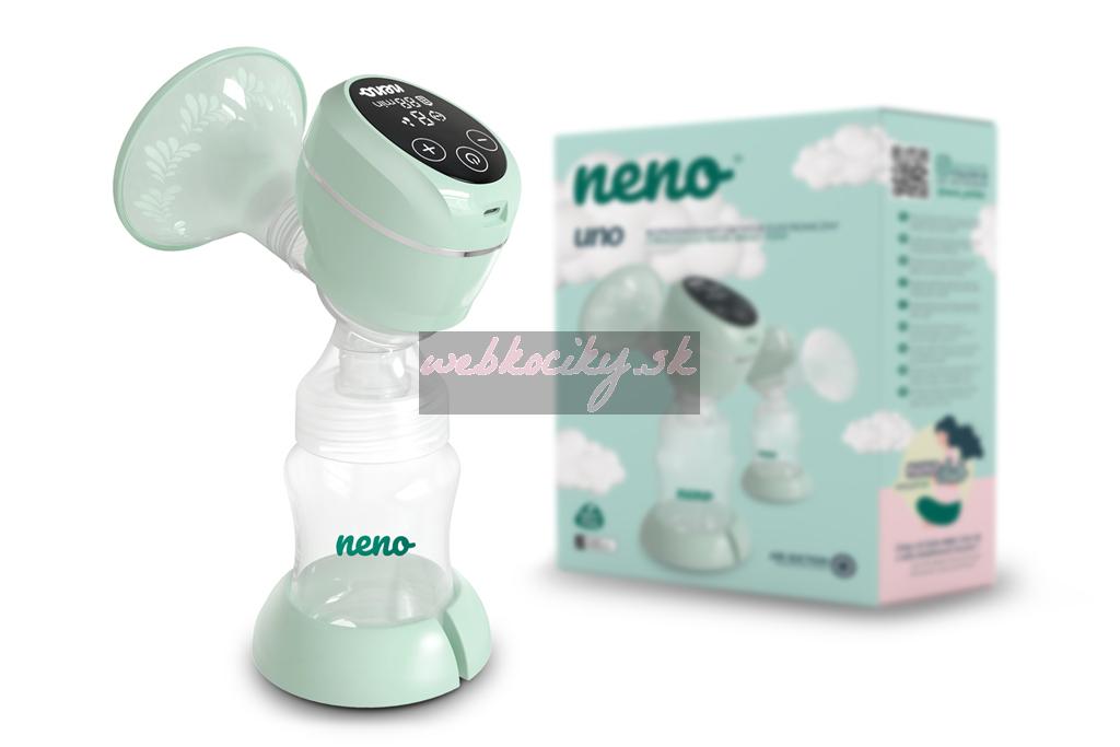 - Obsah balenia: odsávačka Neno Uno, fľaša na mlieko s cumlíkom a vrchnákom, stojan na fľašu, 2× ventil, vrecká na uskladnenie mlieka, prsný štít 24 mm, kryt prsných chráničov, USB typ-C kábel, návod na použitie