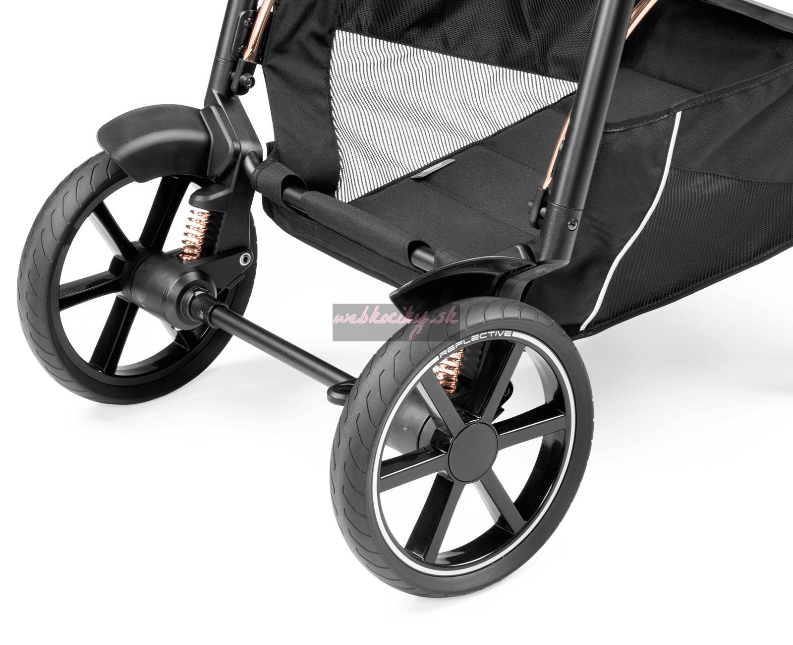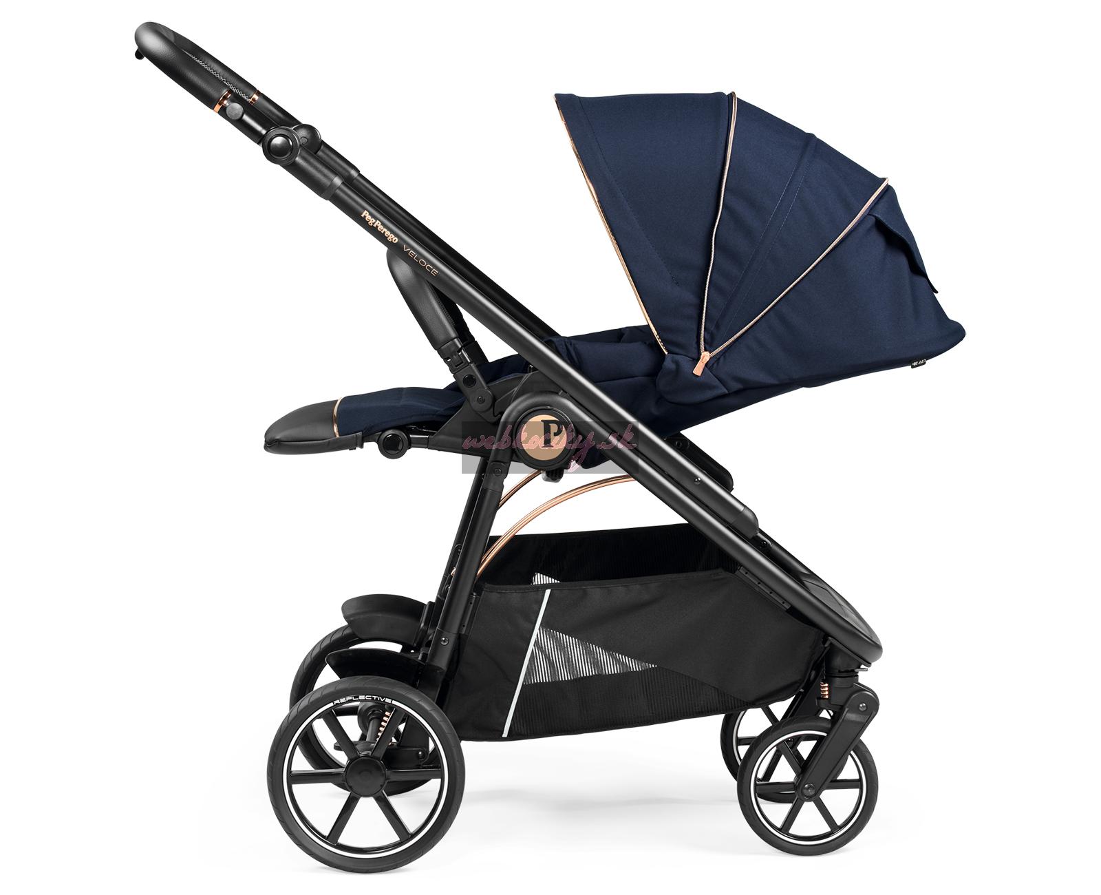Výškovo nastaviteľná rukoväť v eco koži zabezpečuje to najpohodlnejšie a najprívetivejšie ovládanie kočíka i len jednou rukou. Keďže aj na obyčajnú prechádzku znamená vziať si so sebou veľa nevyhnutnosí, ľahko prístupný a priestranný košík kočíka Veloce je vybavený vystuženým dnom pre ťažší náklad. Aj na košíku sa nachádzajú reflexné prvky pre vyššiu bezpečnosť počas zníženej viditeľnosti. Či už vaše dieťa v kočíku práve odpočíva alebo objavuje okolitý svet, rozťahovacia UPF 50+ strieška ho ochráni pred slnkom a vetrom. Nemenej užitočný je aj na mieru šitý nánožník, ktorý poskytuje ochranu dieťaťa aj v prípade sklopenej opierky chrbta.