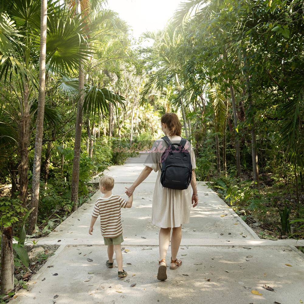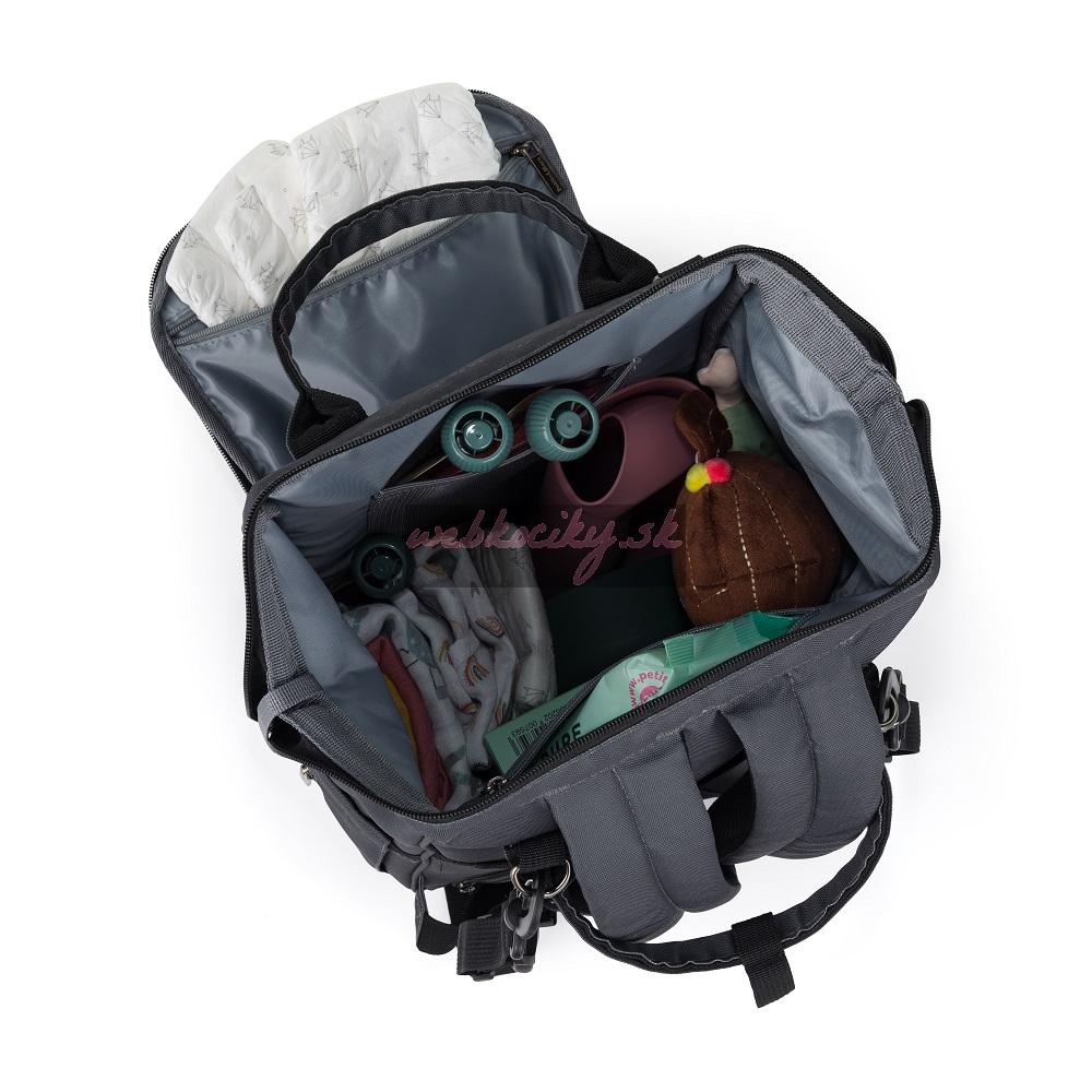 Tento pohodlný a organizačne premyslený batoh je vyrobený z kvalitných materiálov odolných voči vlhkosti. Má bočné popruhy na pripevnenie ku kočíku a hlavná priehradka sa zapína na dvojcestný zips. Veľké množstvo vreciek vrátane funkčných vreciek a jednoduchý prístup k obsahu vďaka bočnému otváraniu vám výrazne uľahčí balenie na výlet alebo prechádzku.