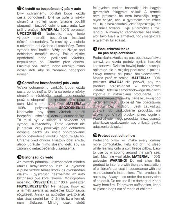 UPOZORNENIE Nedovoľte, aby tento výrobok narušil bezpečnú inštaláciu detskej autosedačky. Tá musí byť v súlade s návodom od výrobcu autosedačiek. Tento výrobok nie je hračka. Vždy používajte pod dohľadom dospelej osoby. Ak zistíte opotrebovanie alebo poškodenie výrobku, nepoužívajte ho. Chráňte pred ohňom. Plastový obal zničte, alebo udržujte mimo dosah detí, aby sa zabránilo nebezpečenstvu udusenia.
