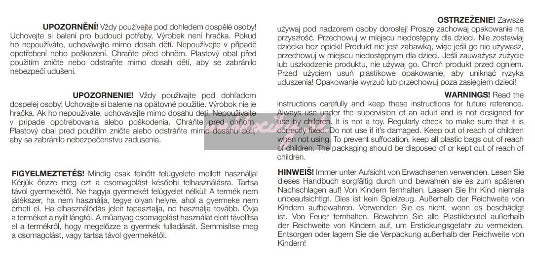 UPOZORNENIE Vždy používajte pod dohľadom dospelej osoby! Uchovajte si balenie na opätovné použitie. Výrobok nie je hračka. Ak ho nepoužívate, uchovávajte mimo dosahu detí. Nepoužívajte v prípade opotrebovania alebo poškodenia. Chráňte pred ohňom. Plastový obal zničte, alebo udržujte mimo dosah detí, aby sa zabránilo nebezpečenstvu udusenia.