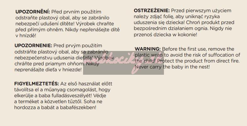 Pred prvým použitím odstráňte plastový obal, aby sa zabránilo nebezpečenstvu udusenia dieťaťa! Výrobok chráňte pred priamym ohňom. Nikdy neprenášajte dieťa v hniezde!