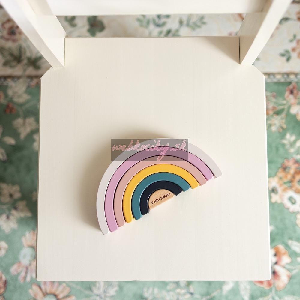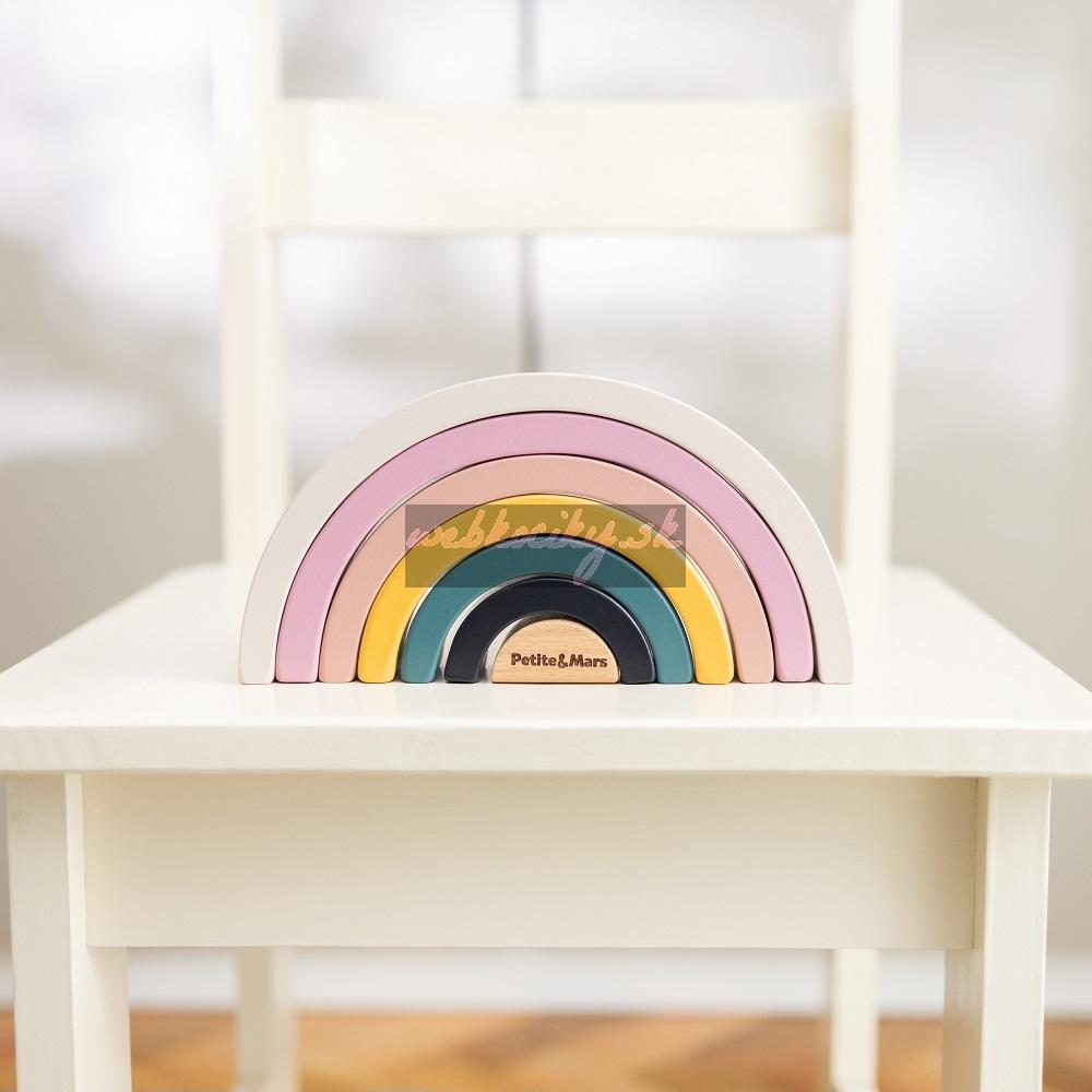 Drevená skladacia hračka STARDUST v tvare dúhy bude rozvíjať motorické zručnosti, schopnosť rozpoznávať tvary a farby a stimulovať vizuálnu a priestorovú predstavivosť.
