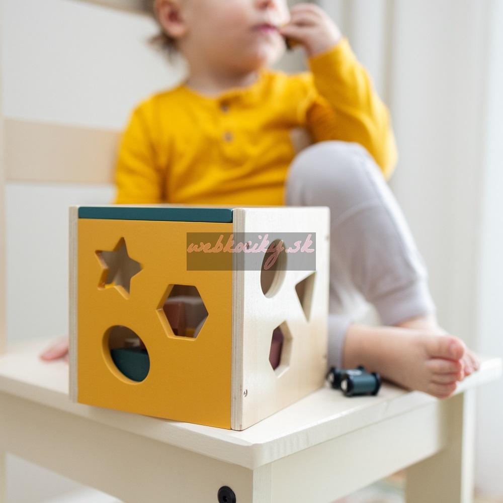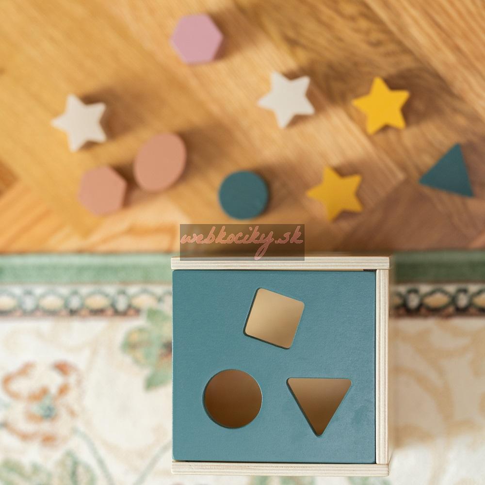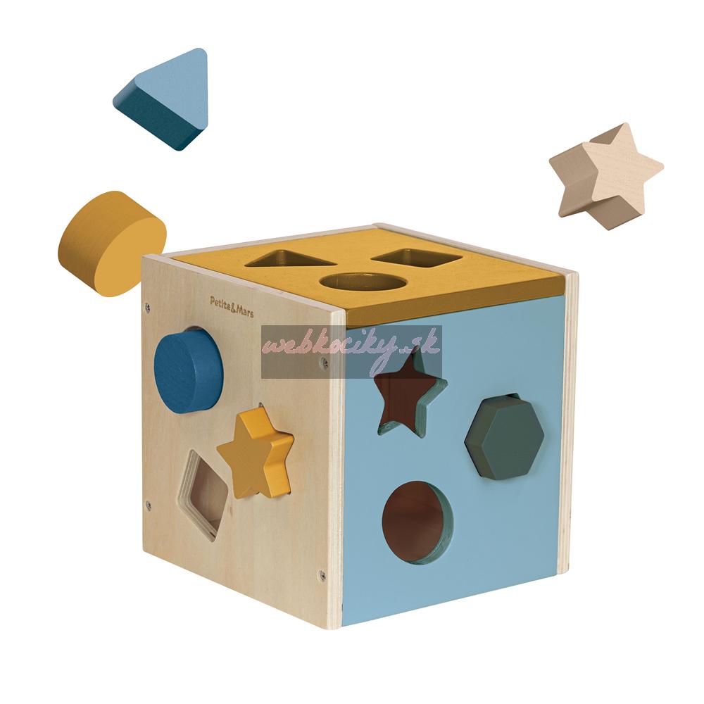 Súprava obsahuje drevenú kocku so štyrmi stranami na triedenie a 12 farebných kociek rôznych tvarov, napríklad trojuholníka, hviezdy, štvorca, kosoštvorca alebo kruhu.