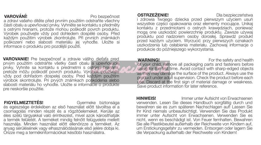 Pre bezpečnosť a zdravie vášho dieťaťa pred prvým použitím odstráňte všetky časti obalu a upevňovacie prvky. Vyhnite sa kontaktu s predmetmi s ostrými hranami, pretože môžu poškodiť povrch produktu. Výrobok používajte vždy pod dohľadom dospelej osoby. Pred každým použitím výrobok skontrolujte. Pri prvých známkach poškodenia alebo slabosti materiálu produkt zlikvidujte. Uložte si informácie o produkte pre neskoršie použitie.