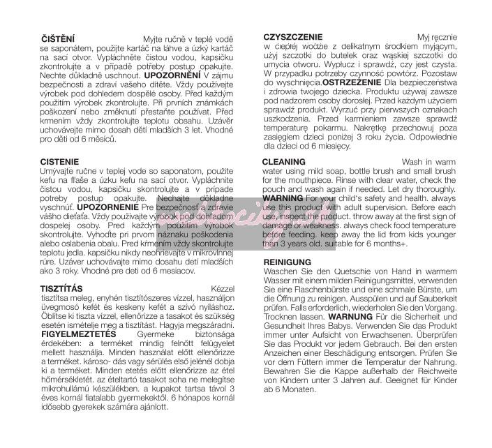UPOZORNENIE Pre bezpečnosť a zdravie vášho dieťaťa. Vždy používajte výrobok pod dohľadom dospelej osoby. Pred každým použitím výrobok skontrolujte. Vyhoďte pri prvom náznaku poškodenia alebo oslabenia obalu. Pred kŕmením vždy skontrolujte teplotu jedla. Kapsičku nikdy neohrievajte v mikrovlnnej rúre. Uzáver uchovávajte mimo dosahu detí mladších ako 3 roky. Vhodné pre deti od 6 mesiacov.
