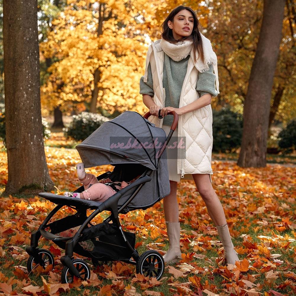 Dieťatku poskytuje komfortné sedenie vďaka priestrannej a dostatočne širokej sedačke. Chrbtovú opierku je možné polohovať, vďaka čomu sa dieťatko v kočíku pohodlne vyspí. Polohovateľná je aj opierka pre nožičky. Predĺžiteľná strieška so šiltom dieťatku poskytne súkromie a ochráni ho pred prudkým slnkom, či nepriaznivým počasím. Kontakt s dieťatkom a jeho kontrolu Vám umožní okienko umiestnené v strieške. Na dotyk príjemné madlo z ekokože je odnímateľné pre ľahké vkladanie dieťaťa do kočíka. Dieťatko bezpečne pripútate 5-bodovým bezpečnostným pásom s polstrovaním.