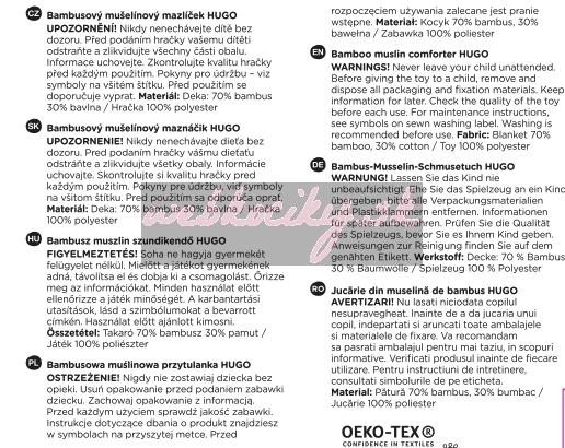 Materiál, z ktorého je Hugo ušitý je veľmi kvalitný a spĺňa Oeko-tex® Standard 100. To znamená, že každá jedna zložka materiálu je pre dieťatko bezpečná a neobsahuje žiadne škodlivé látky.