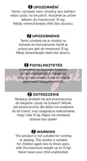 UPOZORNENIE! Tento výrobok nie je vhodný na behanie alebo korčuľovanie. Kočík je určený pre deti do hmotnosti 15 kg. Nikdy nenechávajte dieťa bez dozoru.