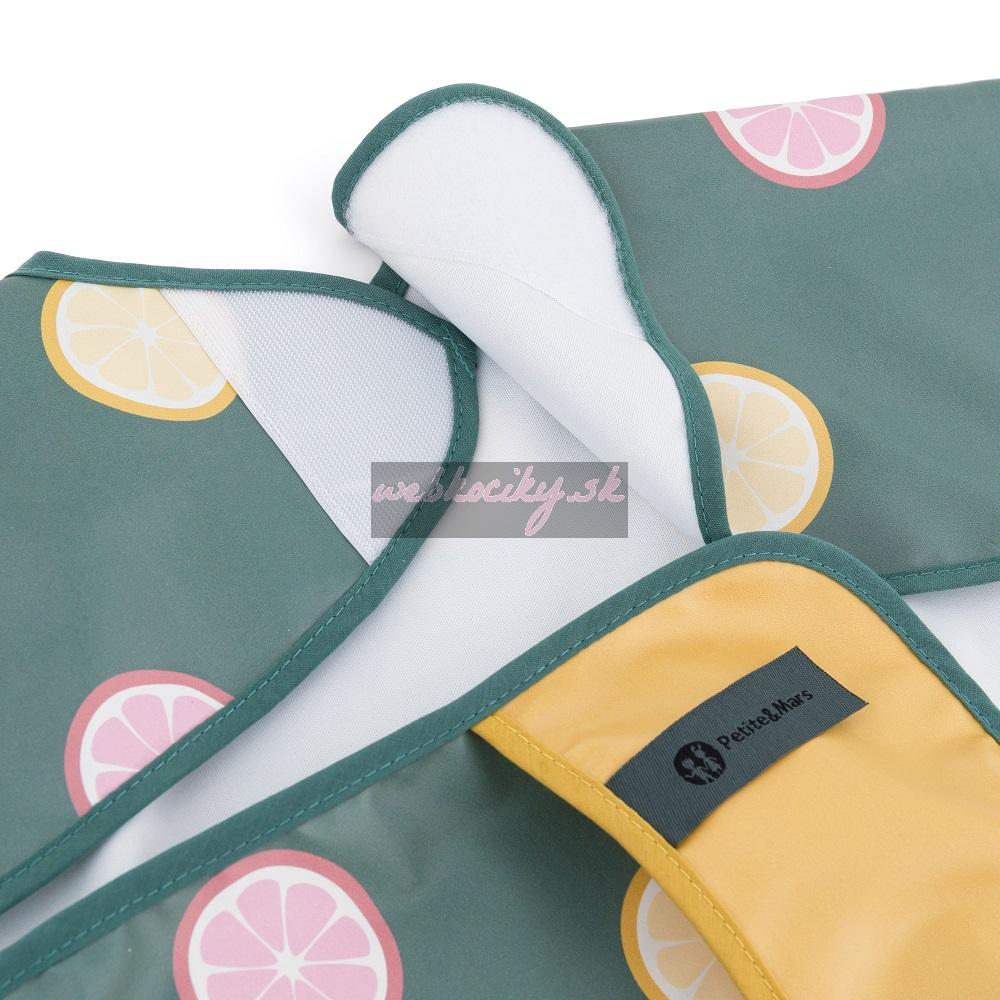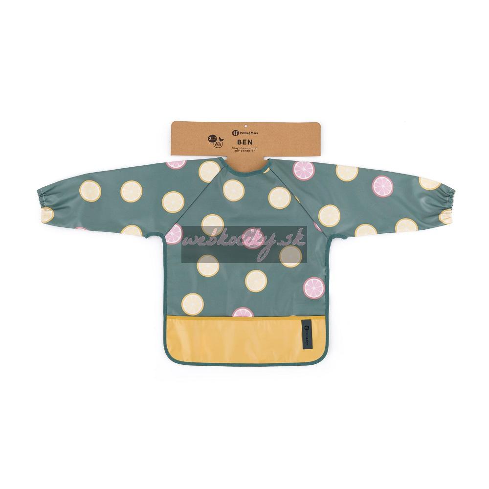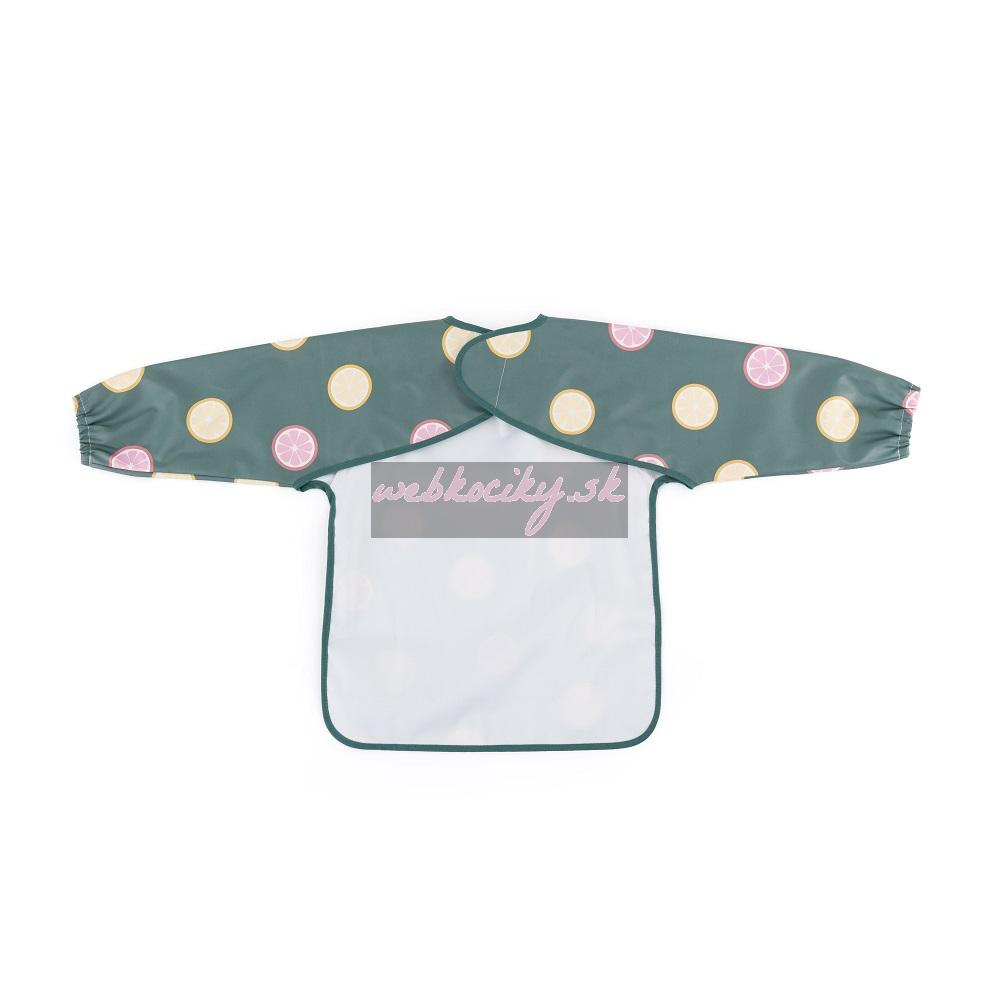 Pohodlný, nepremokavý podbradník s dlhým rukávom je vyrobený z rýchloschnúceho, bezpečného PU materiálu, úplne bez PVC a ftalátov. Predné vrecko na omrvinky zabezpečí poriadok a pohodlie pri kŕmení a dlhé rukávy s gumičkou chránia oblečenie pred zašpinením a namočením. Podbradník je veľmi jemný na dotyk a zapína sa na mäkký suchý zips. Možno ho používať nielen pri jedle, ale aj pri výtvarných prácach. Ak ho chcete udržať v čistote, po použití ho jednoducho utrite vlhkou handričkou.