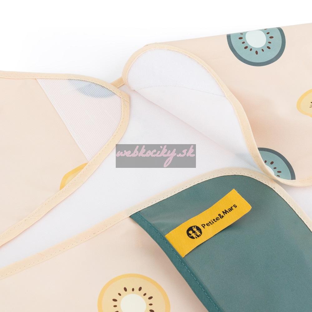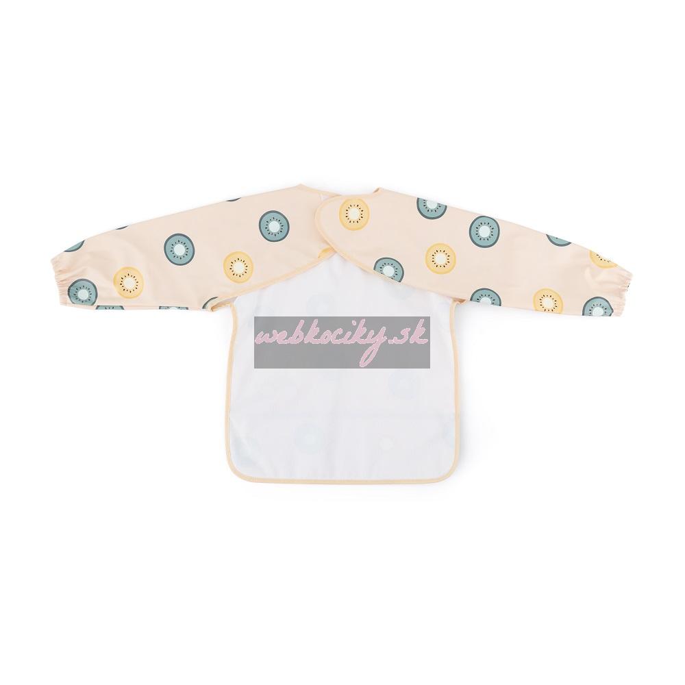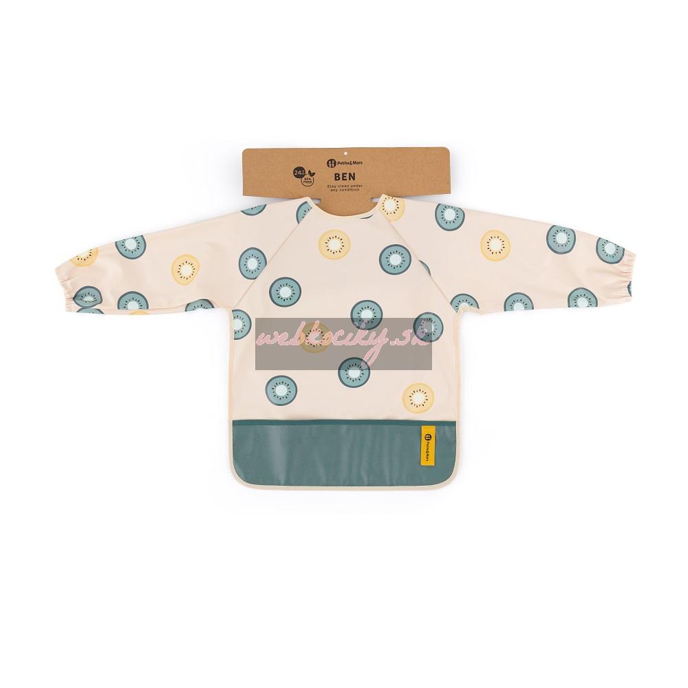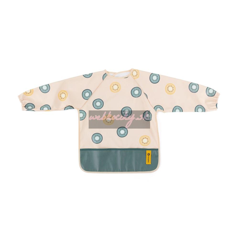 Pohodlný, nepremokavý podbradník s dlhým rukávom je vyrobený z rýchloschnúceho, bezpečného PU materiálu, úplne bez PVC a ftalátov. Predné vrecko na omrvinky zabezpečí poriadok a pohodlie pri kŕmení a dlhé rukávy s gumičkou chránia oblečenie pred zašpinením a namočením. Podbradník je veľmi jemný na dotyk a zapína sa na mäkký suchý zips. Možno ho používať nielen pri jedle, ale aj pri výtvarných prácach. Ak ho chcete udržať v čistote, po použití ho jednoducho utrite vlhkou handričkou.