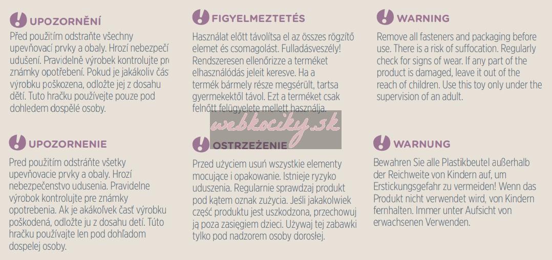 UPOZORNENIE! Pred použitím odstráňte všetky upevňovacie prvky a obaly. Hrozí nebezpečenstvo udusenia. Pravidelne výrobok kontrolujte pre známky opotrebenia. Ak je akákoľvek časť výrobku poškodená, odložte ju z dosahu detí. Túto hračku používajte len pod dohľadom dospelej osoby.