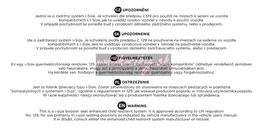 UPOZORNENIE! Toto je zadržiavací systém i-Size. Je schválený podľa predpisu č. 129 na používanie na miestach na sedenie vo vozidlách kompatibilných s i-Size, ako to uvádzajú výrobcovia vozidiel v návode na používanie vozidla. V prípade pochybností sa poraďte buď s výrobcom detského zadržiavaceho systému alebo s predajcom.