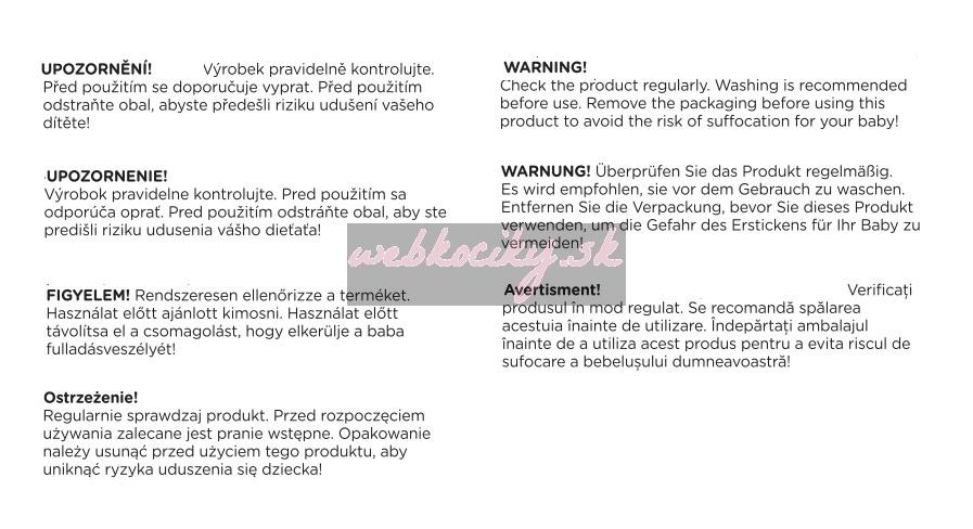 UPOZORNENIE! Výrobok pravidelne kontrolujte. Pred použitím sa odporúča oprať. Pred použitím odstráňte obal, aby ste predišli riziku udusenia vášho dieťaťa!