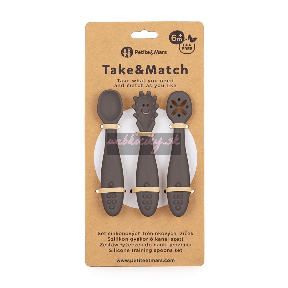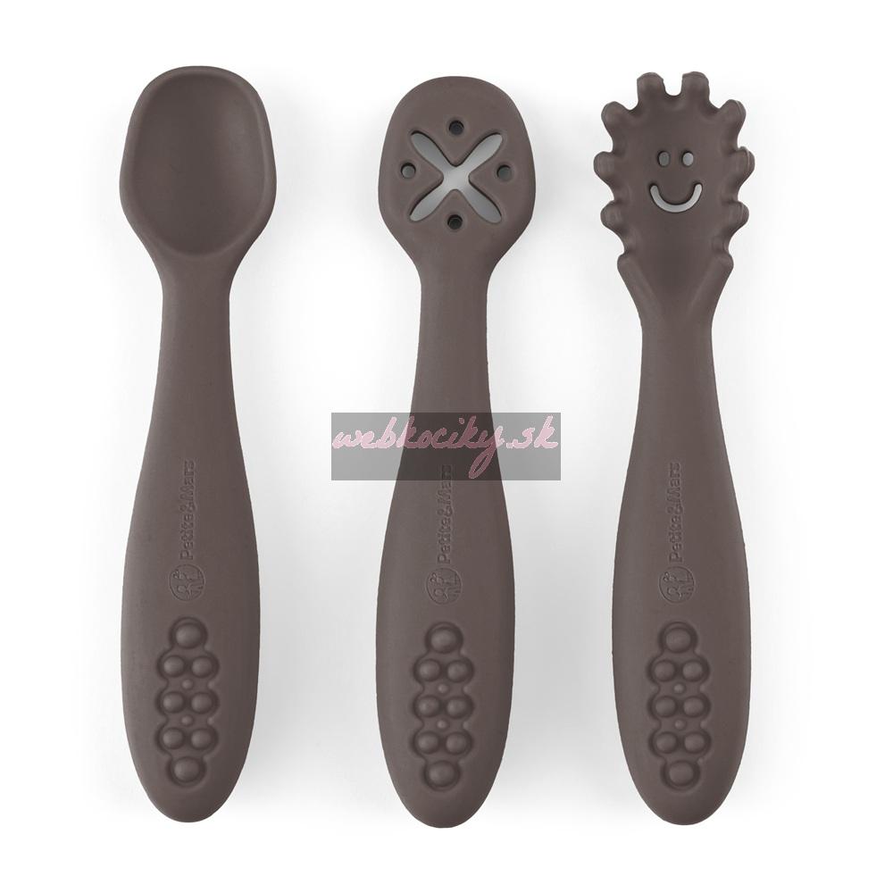 PETITE&MARS Set 3 ks silikónových tréningových lyžičiek Take&Match Bitter Cocoa 6m+