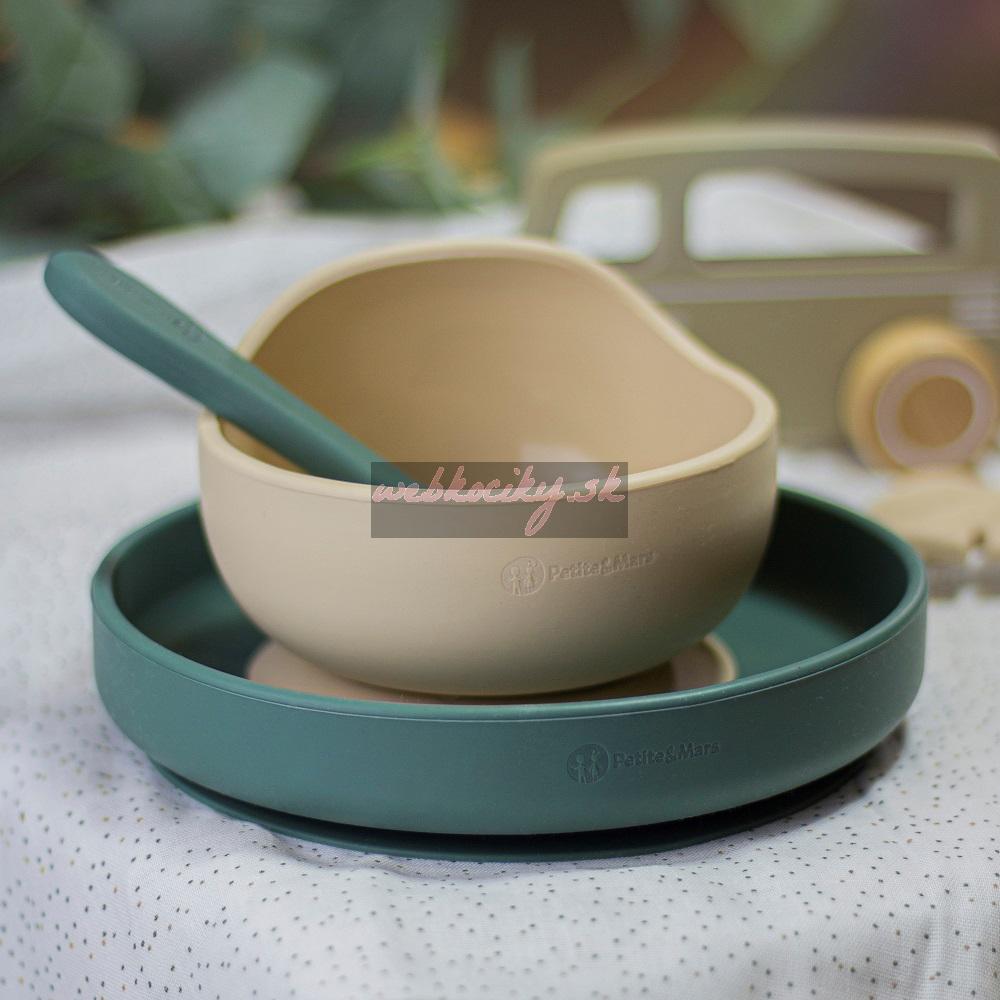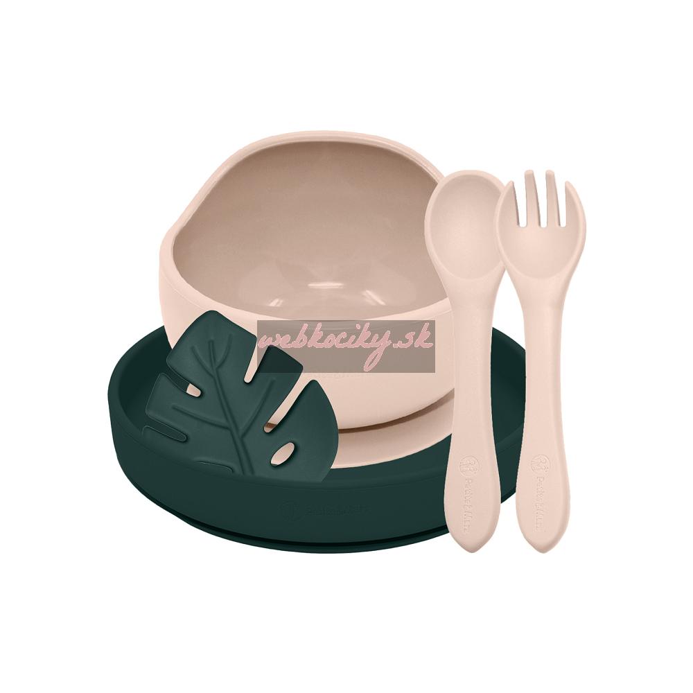 PETITE&MARS Set jedálenský silikónový TAKE&MATCH 4 ks Desert Sand - Misty Green 6m+