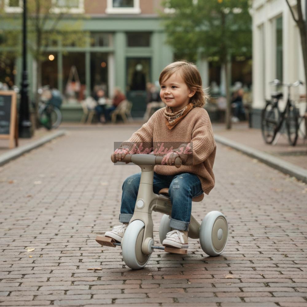Na začiatku poslúži ako stabilná trojkolka (s možnosťou upevniť dve kolieska vpredu alebo vzadu) – ideálna pre malých začiatočníkov, ktorí ešte len hľadajú rovnováhu a učia sa dôverovať vlastným nohám. Keď dieťa trochu podrastie a začne byť v pohybe istejšie, Bingo sa dá jednoducho prestavať na klasické balančné odrážadlo. V tejto fáze sa už odráža samo, reguluje si rýchlosť a trénuje koordináciu aj smer. A keď príde správny čas, stačí nasadiť pedále – Bingo sa zmení na ich prvý bicykel, na ktorom môžu skúsiť prvé šliapanie. Všetko sa dá zvládnuť jednoducho a bez náradia – len pár pohybov a je hotovo.