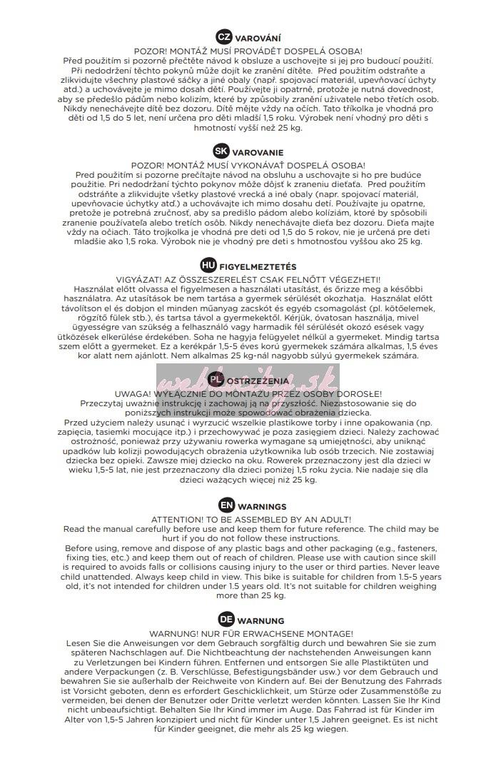UPOZORNENIE! Montáž musí vykonávať dospelá osoba! Pred použitím si pozorne prečítajte návod na obsluhu a uschovajte si ho pre budúce použitie. Pri nedodržaní týchto pokynov môže dôjsť k zraneniu dieťaťa. Pred použitím odstráňte a zlikvidujte všetky plastové vrecká a obaly a uchovávajte ich mimo dosahu detí. Používajte produkt opatrne, pretože je potrebná zručnosť, aby sa predišlo pádom alebo kolíziám, ktoré by spôsobili zranenie používateľa alebo tretích osôb. Nikdy nenechávajte dieťa bez dozoru. Dieťa majte vždy na očiach. Táto trojkolka je vhodná pre deti od 1,5 do 5 rokov, nie je určená pre deti mladšie ako 1,5 roka. Výrobok nie je vhodný pre deti s hmotnosťou vyššou ako 25 kg.