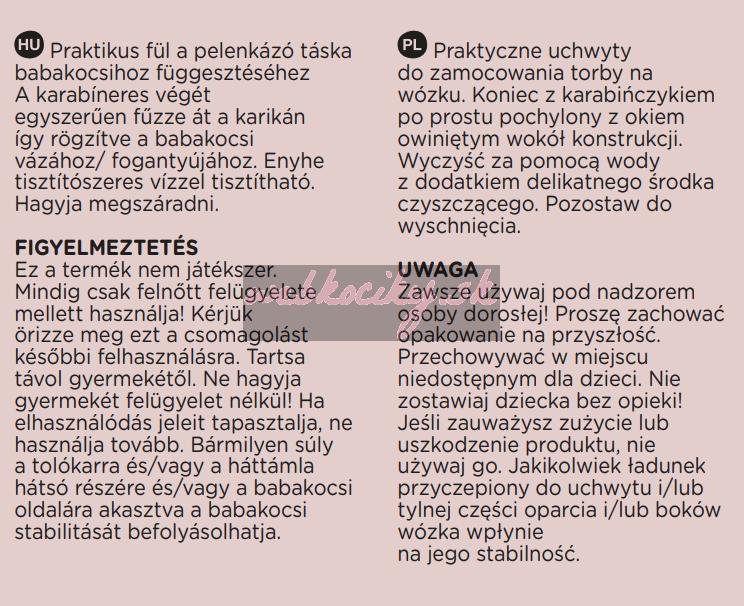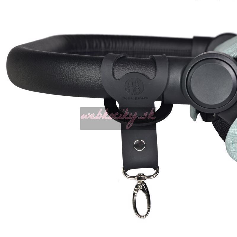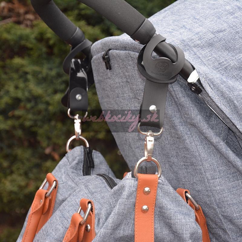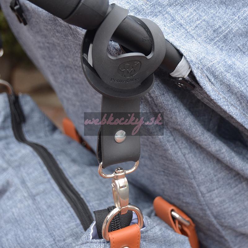 Praktické úchytky na pripevnenie prebaľovacej tašky na kočík. Koniec s karabínkou jednoducho prevlečte okom obtočeným okolo konštrukcie kočíka/rukoväte.