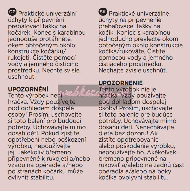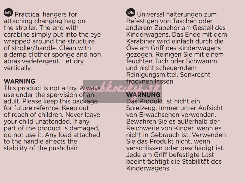 UPOZORNENIE Tento výrobok nie je hračka. Vždy používajte pod dohľadom dospelej osoby. Prosím, uschovajte si balenie pre budúce potreby. Uchovávajte mimo dosahu detí. Nenechávajte dieťa bez dozoru! Ak zistíte opotrebovanie alebo poškodenie výrobku, nepoužívajte ho. Akékoľvek bremeno pripevnené na rukoväť a / alebo na zadnú časť operadla a / alebo na boky kočíka ovplyvní stabilitu.