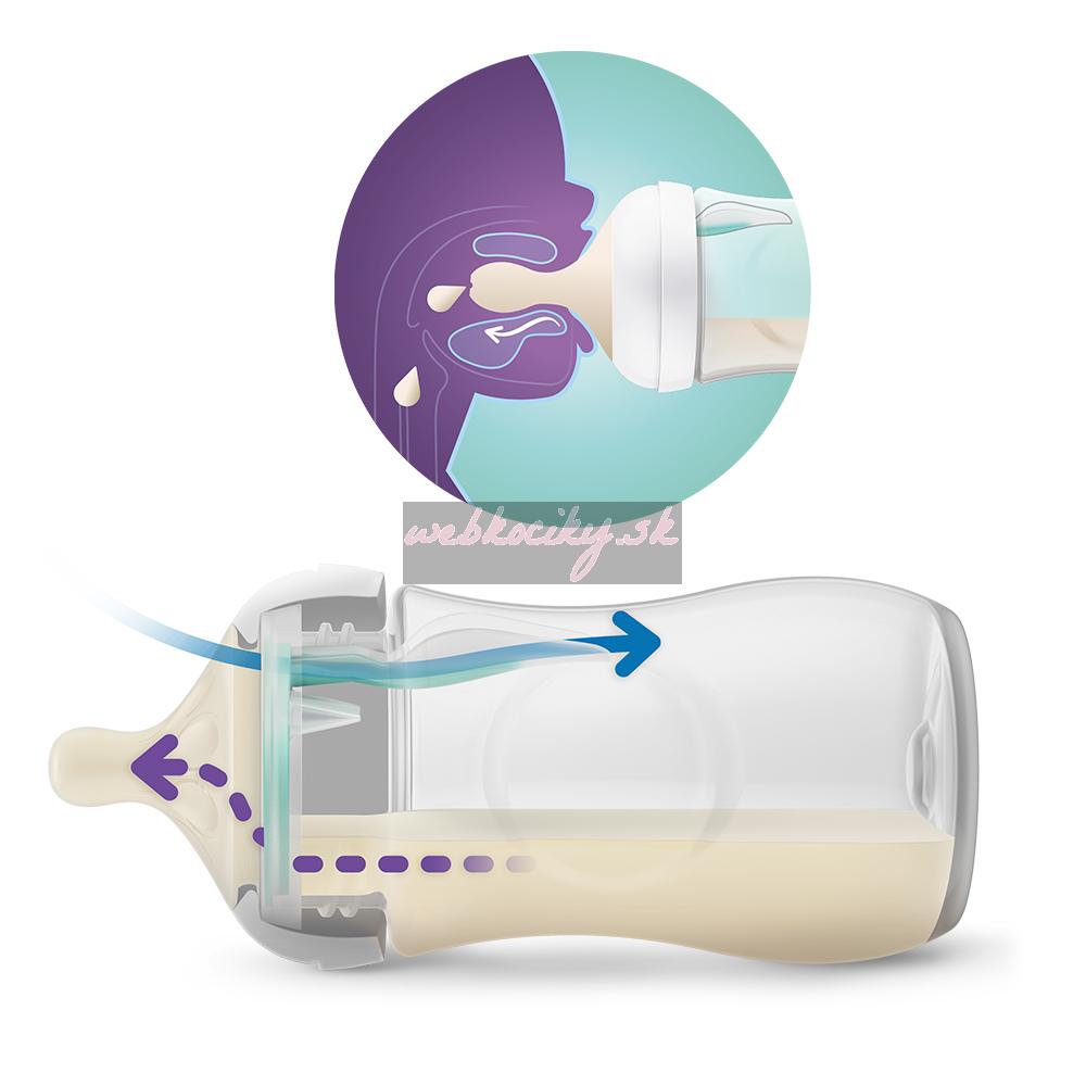 Ventil AirFree - navrhnutý na dodatočnú ochranu proti kolike, nadúvaniu a refluxu vďaka cumlíku, ktorý zostáva plný mlieka, nie vzduchu a umožňuje ľahšie kŕmenie vo vzpriamenej polohe s menším prehĺtaním vzduchu.