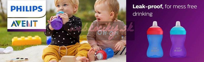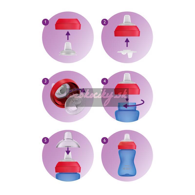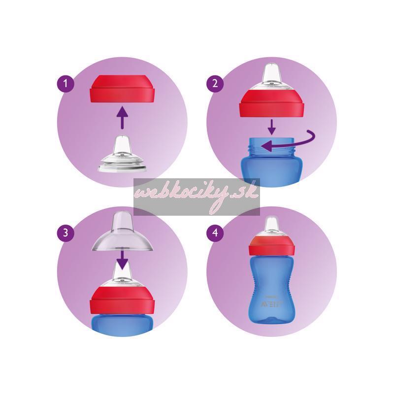 Varovanie – Pred každým použitím hrnček s náustkom skontrolujte. Ak objavíte akúkoľvek prasklinu alebo poškodenie, okamžite prestaňte používať. – Tento výrobok vždy používajte pod dozorom dospelej osoby. – Trvalé a dlhodobé pitie tekutín spôsobuje zubný kaz. – Neodporúčame používať pre ohrievanie tekutín alebo pokrmov mikrovlnnú rúru. Mikrovlnné rúry môžu pozmeniť kvalitu potravín/nápojov a zničiť niektoré cenné živiny a môžu v určitých miestach vytvárať vysoké teploty. Pri ohrievaní jedla v mikrovlnnej rúre preto dbajte na zvýšenú opatrnosť. Keď ohrievate tekutiny alebo jedlo v mikrovlnnej rúre, vkladajte do nej iba nádobu bez tesniaceho krúžku, náustku a bez vrchnáku. Ohriate jedlo vždy premiešajte, aby ste zaistili rovnomerné rozloženie tepla. – Pred kŕmením vždy skontrolujte teplotu pokrmu. – Nedovoľte dieťaťu, aby sa hralo s malými časťami alebo aby pri používaní fliaš a hrnčekov chodilo či behalo. – Všetky časti, ktoré nepoužívate, udržujte mimo dosahu detí. Upozornenie – Pred prvým použitím rozoberte všetky časti a dôkladne ich umyte a sterilizujte. Diely hrnčeka s náustkom dajte na 5 minút do vriacej vody. Tým zaistíte nevyhnutnú hygienu. – Hrnček s náustkom môžete sterilizovať aj v elektrickom sterilizátore alebo sterilizátore do mikrovlnnej rúry. Sterilizáciu akejkoľvek časti hrnčeka s náustkom v mikrovlnnej rúre robte jedine použitím vhodného sterilizátora alebo sterilizačných sáčkov (SFC297) Philips AVENT. – Pred podaním hrnčeka s náustkom dieťaťu vždy skontrolujte, či sú všetky časti správne zostavené. – Tento hrnček s náustkom je určený pre riedke nápoje. Najlepšími nápojmi pre dieťa akéhokoľvek veku sú voda a mlieko. – Husté či perlivé nápoje alebo nápoje obsahujúce dužinu môžu upchať ventil a spôsobiť jeho rozbitie alebo netesnosť. – Hrnček s náustkom nie je určený na prípravu dojčenskej výživy. Hrnček s náustkom nepoužívajte na miešanie ani pretrepávanie dojčenskej výživy, pretože by mohlo dôjsť k upchaniu otvorov a následnej netesnosti hrnčeka. Vrchnák hrnčeka s náustkom príliš neuťahujte. – Náustok nepoužívajte ako cumlík. – Hrnček s náustkom nepoužívajte so sklenenými fľašami. – Nevkladajte hrnček s náustkom do mrazničky. – Aby nedošlo k popáleniu, nechajte horúcu tekutinu pred naplnením hrnčeka s náustkom vychladnúť.