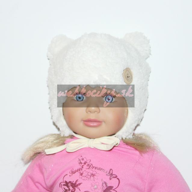 Príjemne teplá detská zimná čiapka s uškami na viazanie. Vytvorená z materiálu SHERPA, ktorá je mäkká a huňatá. Pripomína kučeravú vlnu alebo ovčiu kožušinu. Zdobená roztomilou nášivkou medvedíka v prednej časti.