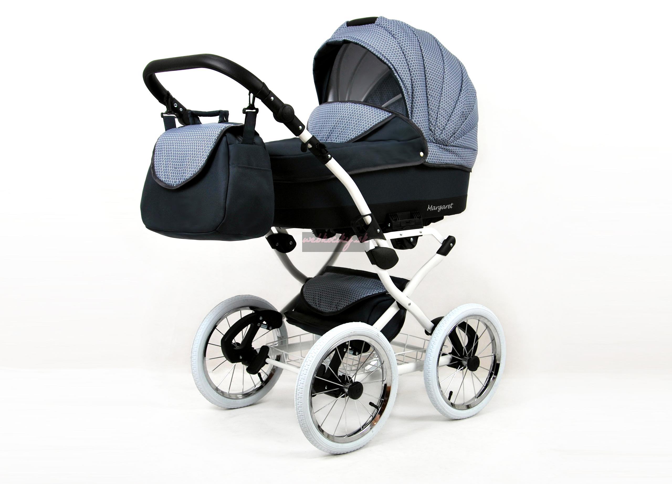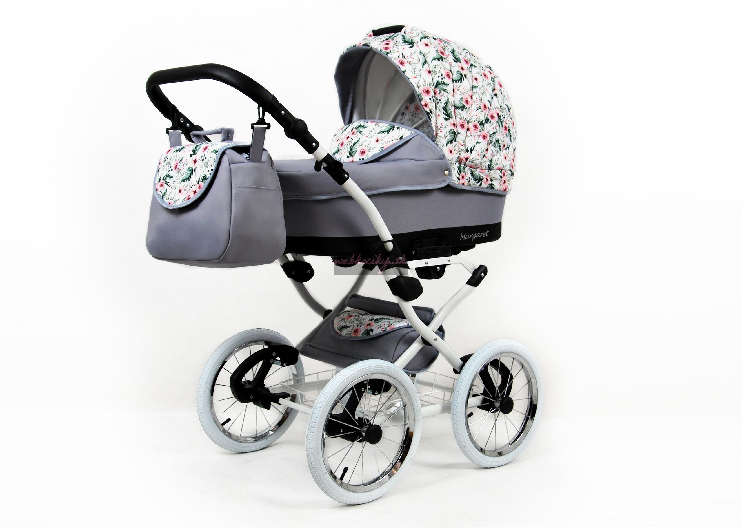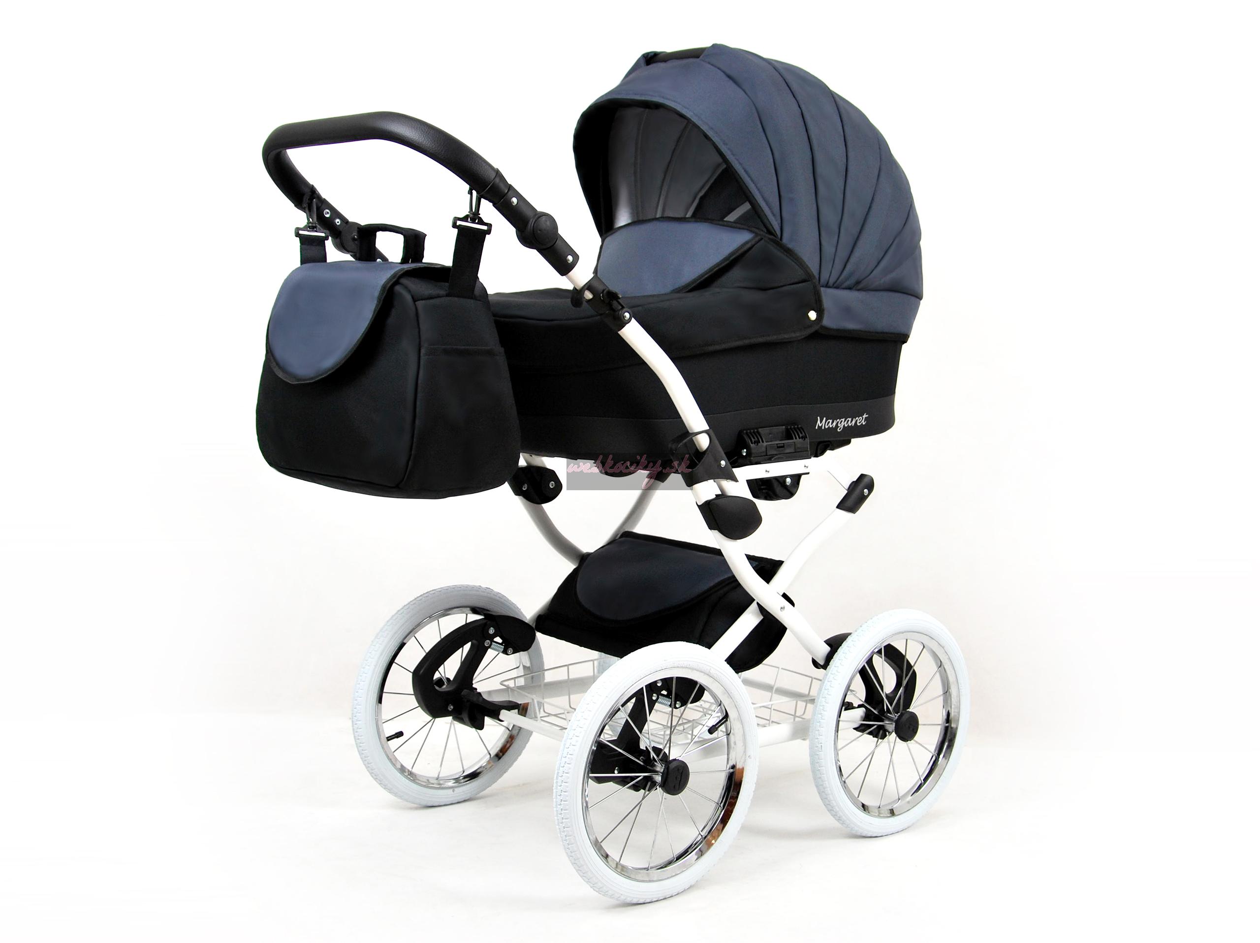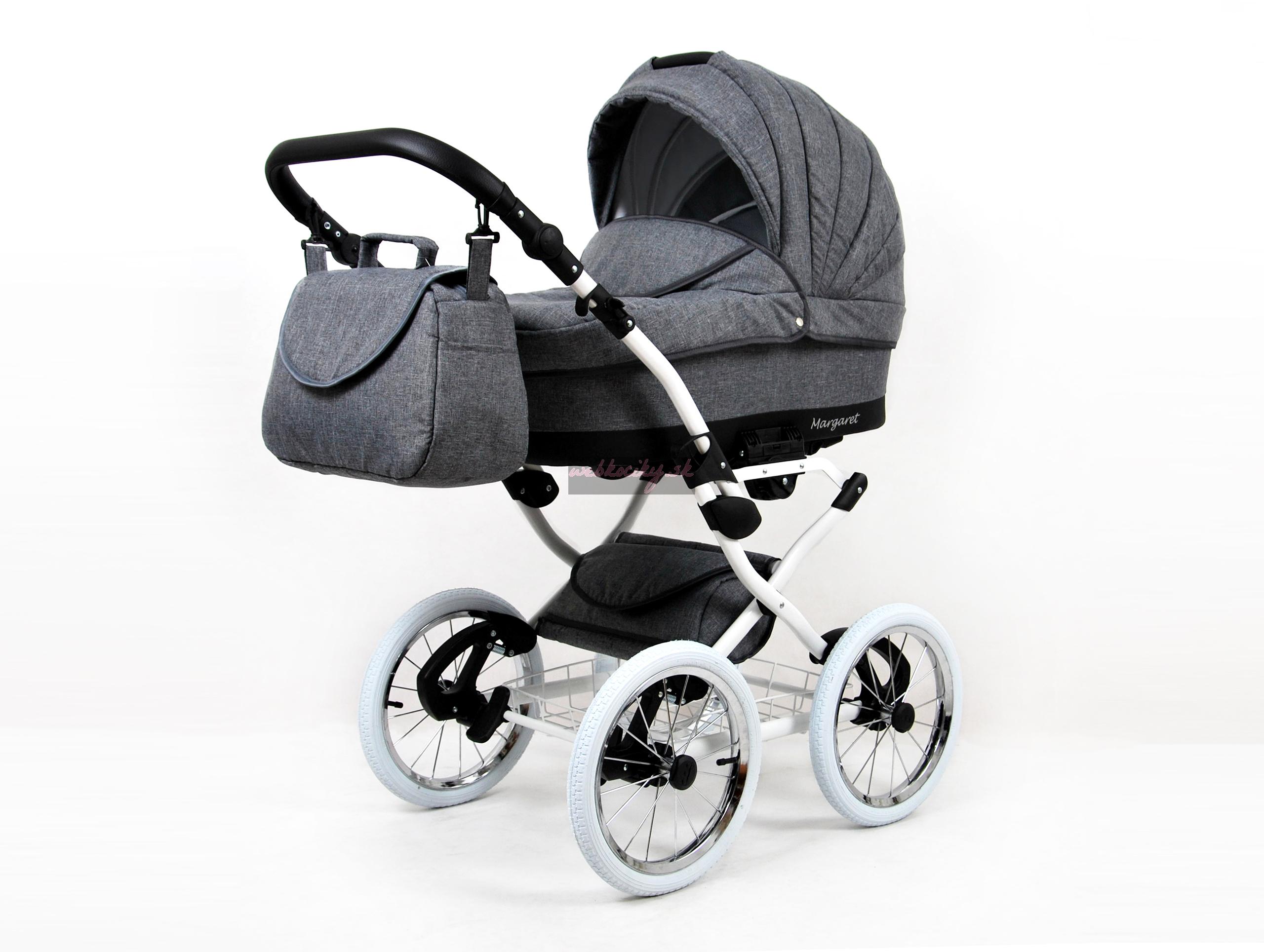Nová kolekcia kočíkov Margaretmá pevnú konštrukciu z kvalitných materiálov. Kožené čalúnenie a detaily v kombinácii s precíznou farebnou tkaninou, ktorá podčiarkuje jedinečnosť a atraktívny dizajn tejto kolekcie. Pohodlná a veľká nákupná taška je taktiež veľmi praktická v každodenných situáciách.