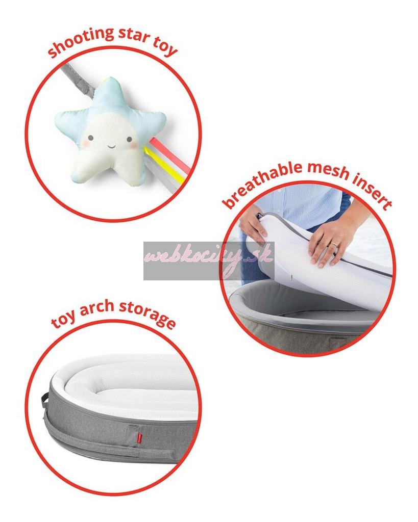 Odnímateľná hrazdička s plyšovou hračkou v tvare padajúcej hviezdy zaujme dieťatko, keď leží na chrbte a hrá sa. Hniezdo je skvelé nielen na domáce hranie, ale aj na cesty, na návštevu k starým rodičom, stačí ho zabaliť do priloženého puzdra a môžete vyraziť.