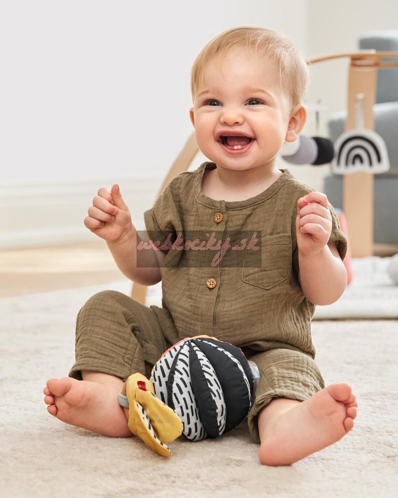 - Mäkká hrkajúca loptička s vysoko kontrastným vzorom a farebnými prvkami.