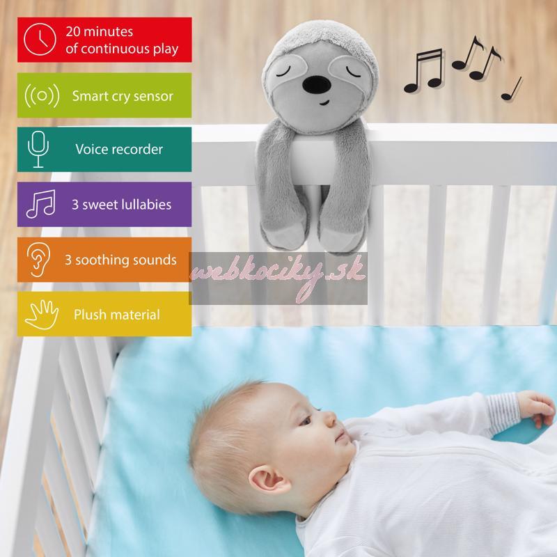 Inteligentný senzor plaču v podobe leňochoda upokojí dieťatko sladkými piesňami, zvukmi prírody a nahratým hlasom – dokonca aj uprostred noci! Tento plyšový priateľ automaticky reaguje na plač a krik dieťatka, aby sa upokojilo, čím sa bábätko a aj rodičia v noci lepšie vyspia. Jednoducho ho pripojte k postieľke. Prehráva 3 uspávanky a 3 upokojujúce zvuky. Umožňuje rodičom nahrať hlasový záznam až po dobu 20 minút. Plyšový priateľ rastie spolu s dieťatkom a bude jeho neodlúčiteľným spoločníkom.