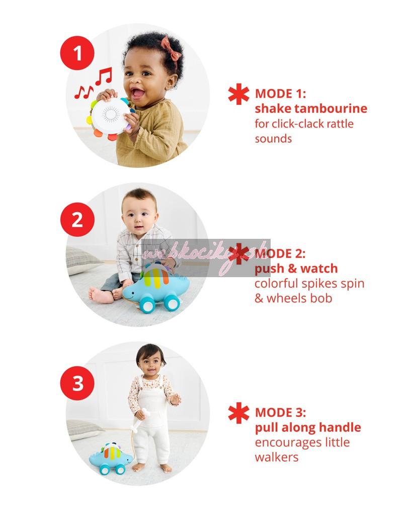 Náš rozkošný trasúci sa stegosaurus vďaka trom režimom hry – tamburína, tlačiaca hračka a ťahacia hračka rastie spolu s dieťaťom, od sediaceho až po chodiace. Odnímateľná tamburína sa malým ručičkám ľahko sama trasie. Alebo položte tamburínu na chrbát dinosaura, zatlačte na ňu a sledujte, ako sa hroty otáčajú, zatiaľ čo sa kolesá otáčajú hore a dole. V režime pripojená „kosťová“ rukoväť povzbudzuje malých chodcov, aby so sebou vzali svojho zábavného dino kamaráta na prechádzku.