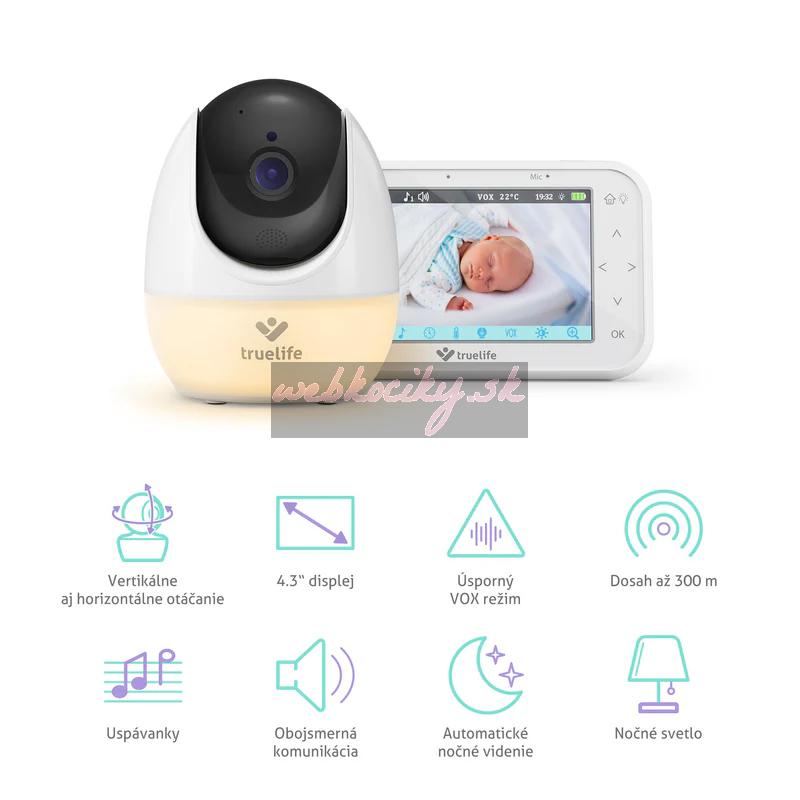 360° rotačná opatrovateľka TrueLife NannyCam R4 Pro, 4,3" LCD IPS displej, dosah až 300 m, automatické nočné videnie, batéria až 17 h, VOX režim, nočné svetlo, obojsmerná komunikácia, 8 uspávaniek, detekcia teploty v miestnosti, pripomenutie