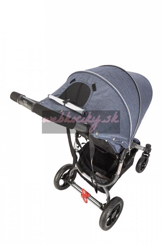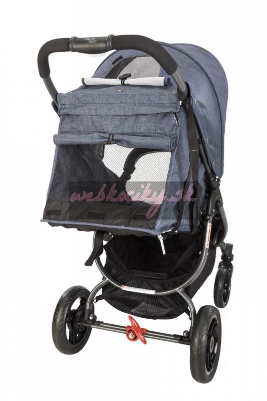- na zadnej časti opierky sú umiestnené dve vrecká, ktoré je možné zrolovať, čím sa odkryje sieťové okienko cez ktoré cirkuluje vzduch v kočíku