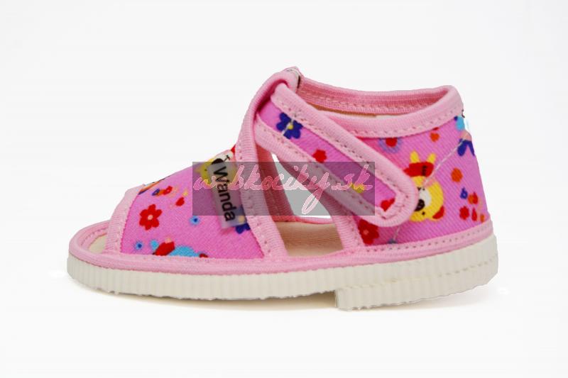 Zloženie: Detské papučky z prírodného textilného materiálu sandálkového typu s otvorenou špičkou. Podošva je vyrobená z mäkkého, ale odolného styroporu. Uzatváranie je na suchý zips. Papučky majú podporu priečnej klemby.