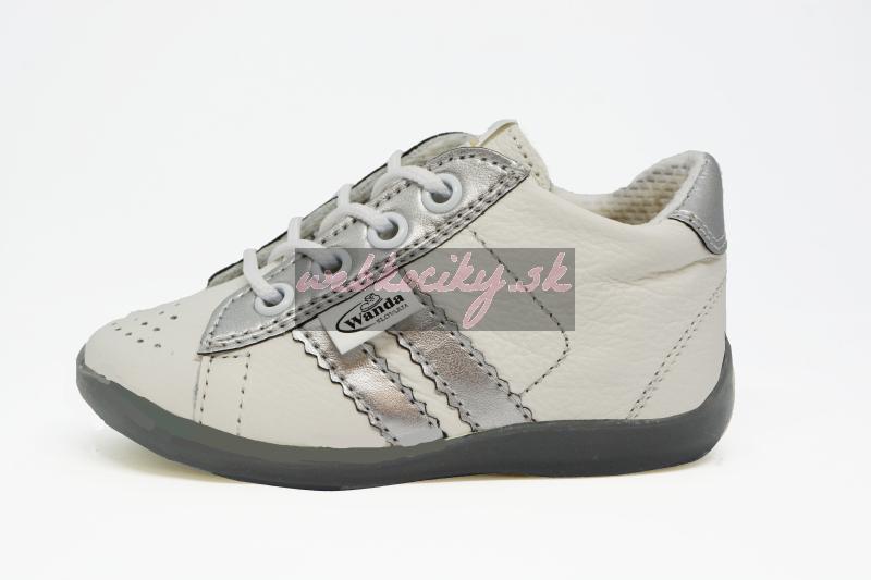 Materiál: Je zdravotne nezávadná, vyrábaná výhradne z certifikovaných polotovarov Európskeho pôvodu. Zvršok je z prírodnej hovädzej alebo teľacej kože. Podšívka v topánočkách WANDA je z dobre savého textilu Cambrella. Stielky sú taktiež z textilného materiálu s mikrovlánkom, čo zaručuje dobrú nasiakavosť, ako i rýchle odparovanie potu z detskej obuvi.Taktiež sú vybavené podporou klenby pre lepší vývoj detskej nôžky.