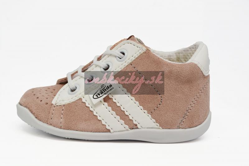 Materiál: Je zdravotne nezávadná, vyrábaná výhradne z certifikovaných polotovarov Európskeho pôvodu. Zvršok je z prírodnej hovädzej alebo teľacej kože. Podšívka v topánočkách WANDA je z dobre savého textilu Cambrella. Stielky sú taktiež z textilného materiálu s mikrovlánkom, čo zaručuje dobrú nasiakavosť, ako i rýchle odparovanie potu z detskej obuvi.Taktiež sú vybavené podporou klenby pre lepší vývoj detskej nôžky.