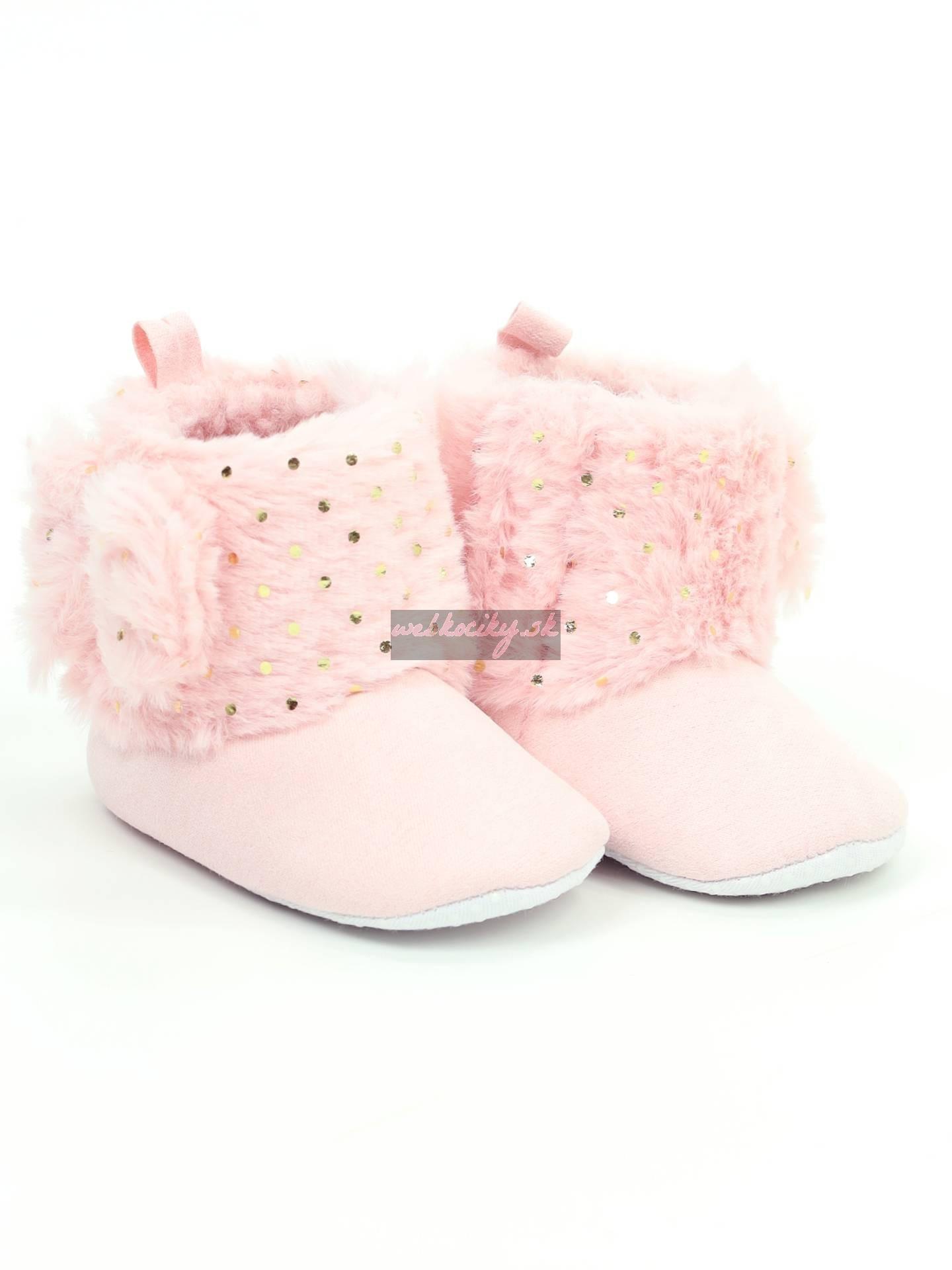 Krásne dievčenské čižmy vo svetlo ružovej farbe s kožúškom a mašľou na boku. Budú sa hodiť na každodenné prechádzky v chladnejších dňoch pre deti, ktoré ešte nechodia. Vďaka bočnému zapínaniu na dlhý suchý zips sa dajú doširoka roztvoriť, rýchlo nasadiť a prispôsobiť detskej nohe.Vyrobené s dôrazom na každý detail z vysoko kvalitných materiálov.Vnútro topánky je podšité jemným kožúškom, ktorý vaše nohy nielen zahreje, ale tiež im poskytne pohodlie. Topánky sú veľmi ľahké, mäkké a pružné, zaručujú pohodlie pri nosení.