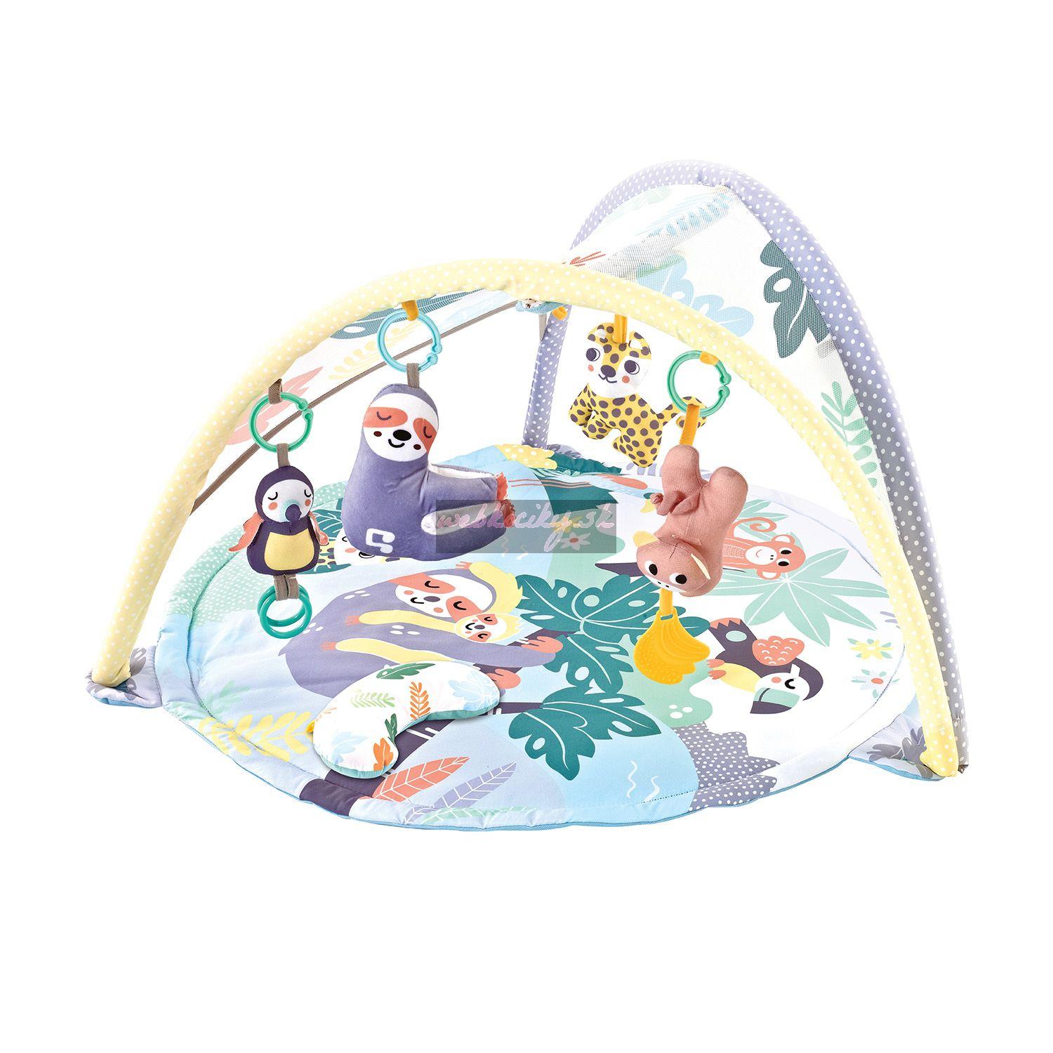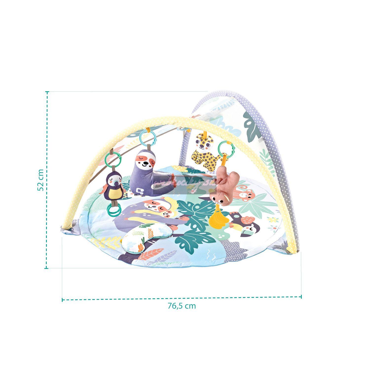 Súčasťou podložky na aktivity je tvarovaný vankúšik, ktorý sa stane skvelým pomocníkom na pasenie koníčkuů. Vďaka tomu deti dostanú potrebnú podporu. Závesné hračky je možné pripevniť na vankúšik, vďaka pútkam bábätku nikam neutečú, motivujú bábätko k správnemu držaniu tela. Neskôr vankúšik využijete aj pri nácviku plazenia, keď ho dáte bábätku pod bruško.