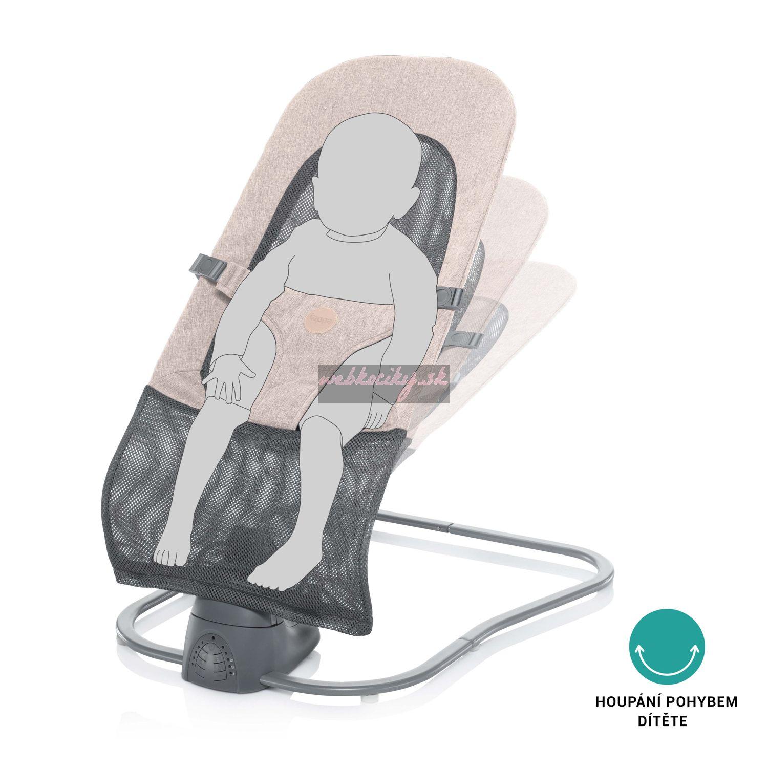 Opierka chrbta je nastaviteľná do 3 polôh podľa toho, či chce dieťa pozorovať svet okolo seba, alebo radšej spať. Systém hojdania je zabezpečený dvoma spôsobmi - prvý je nezávislý na elektrickej energii, pričom sa lehátko hojdá spolu s pohybmi dieťaťa, a druhý je pomocou elektromotora, ktorý hojdá lehátko do strán. Elektrické hojdanie má 5 druhov intenzity, ktorú si môžete ľubovoľne zvoliť podľa toho, čo je pre dieťa najpohodlnejšie.